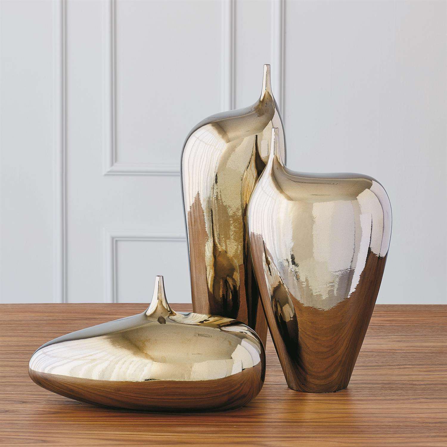 [0] => The Medium Offset Neck Object has a rounded, v-shaped body that tapers to a strikingly narrow mouth on one side, just wide enough to accommodate a single faux flower if one chooses. This one-of-a-kind silhouette is paired with a bronze crackle glaze whose reflective finish creates a warm and lustrous look. Pair with the companion Small Offset Neck Object for a guaranteed conversation starter.