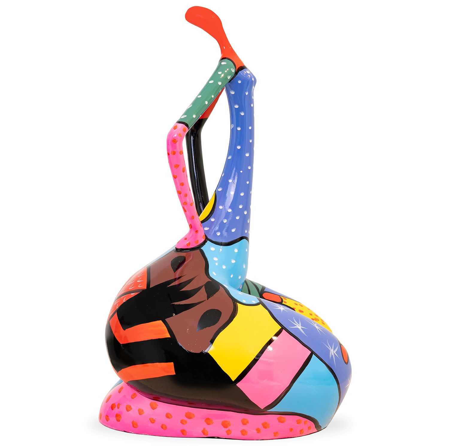 With its bold mix of colors and patterns, the Orange Girl Sculpture is brimming with pizzazz. This sculpture depicts a stylized feminine figure kneeling with her hands on her hips, painted in bright hues of red, pink, purple, green, yellow, and more. Different sections on her body form a mosaic-like effect, featuring patterns and images like polka dots, stars, lips, and a watermelon slice. The Orange Girl Sculpture is made of polyresin with a glossy finish and can sit on any flat surface.