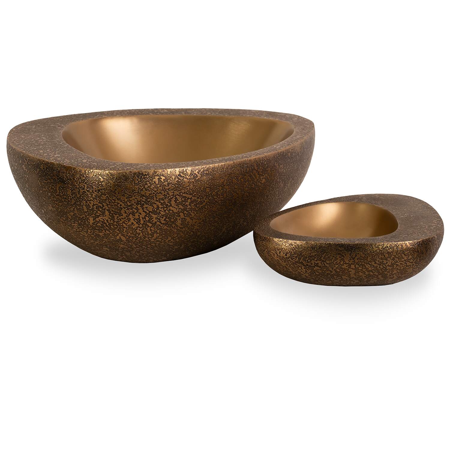 The Ovate Bowls are made of cast aluminum with an antique brass finish that is lightly textured on the outer surface and smooth on the inner concavity. Sold as a set of 2 with one larger bowl and one smaller bowl, each unit has an organic, egg-like shape that makes it ideal for displaying natural decor.