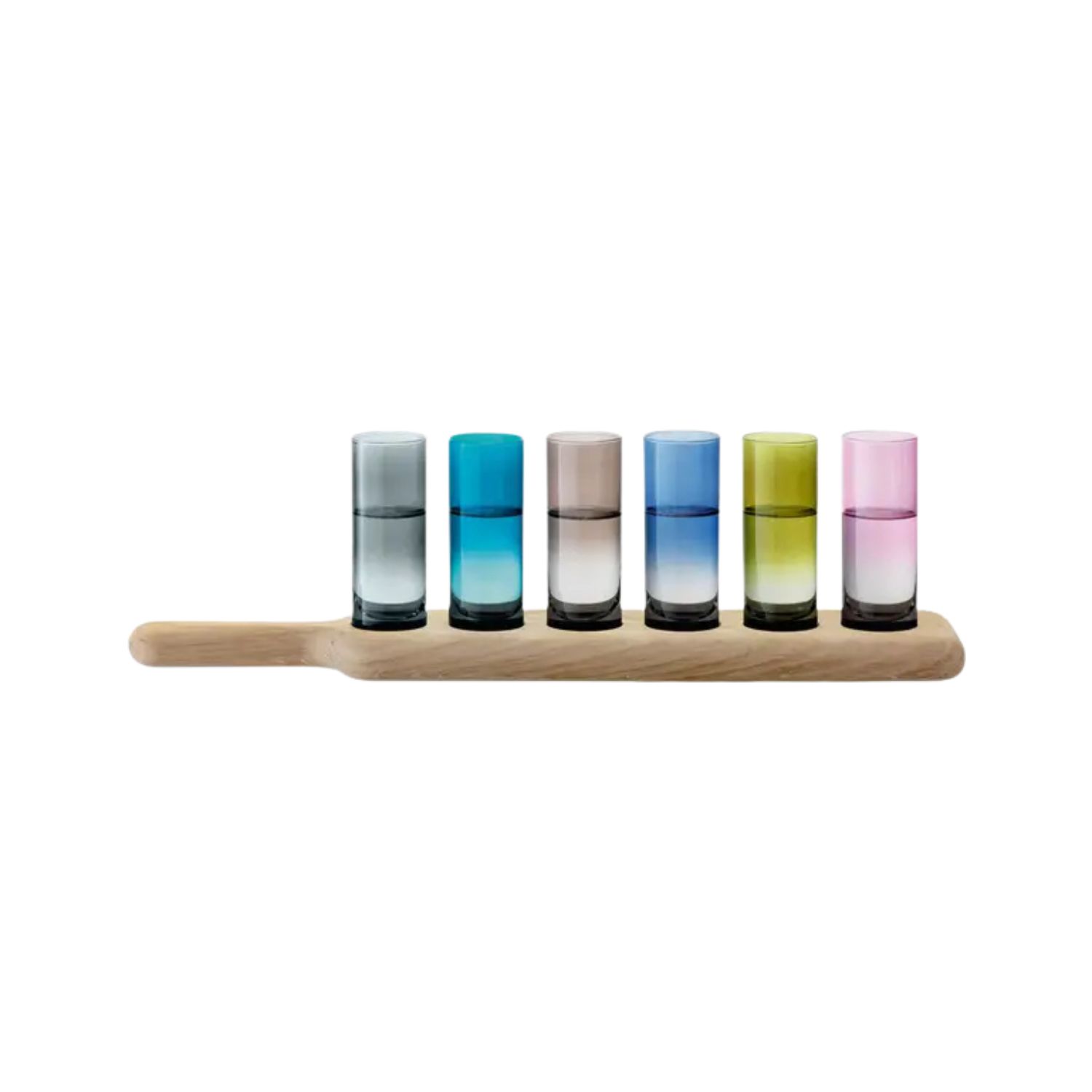 Inspired by serving pieces from Tirolean mountain bars, the Paddle Shot Set includes six ombre shot glasses in grey, teal, brown, blue, chartreuse, and pink that nestle securely within a wooden paddle. Designed with care by LSA International, the paddle is made with FSC-certified oak wood and finished by hand for a smooth feel. Perfect for serving your favorite spirits, the Paddle Shot Set will add color and fun to any gathering.