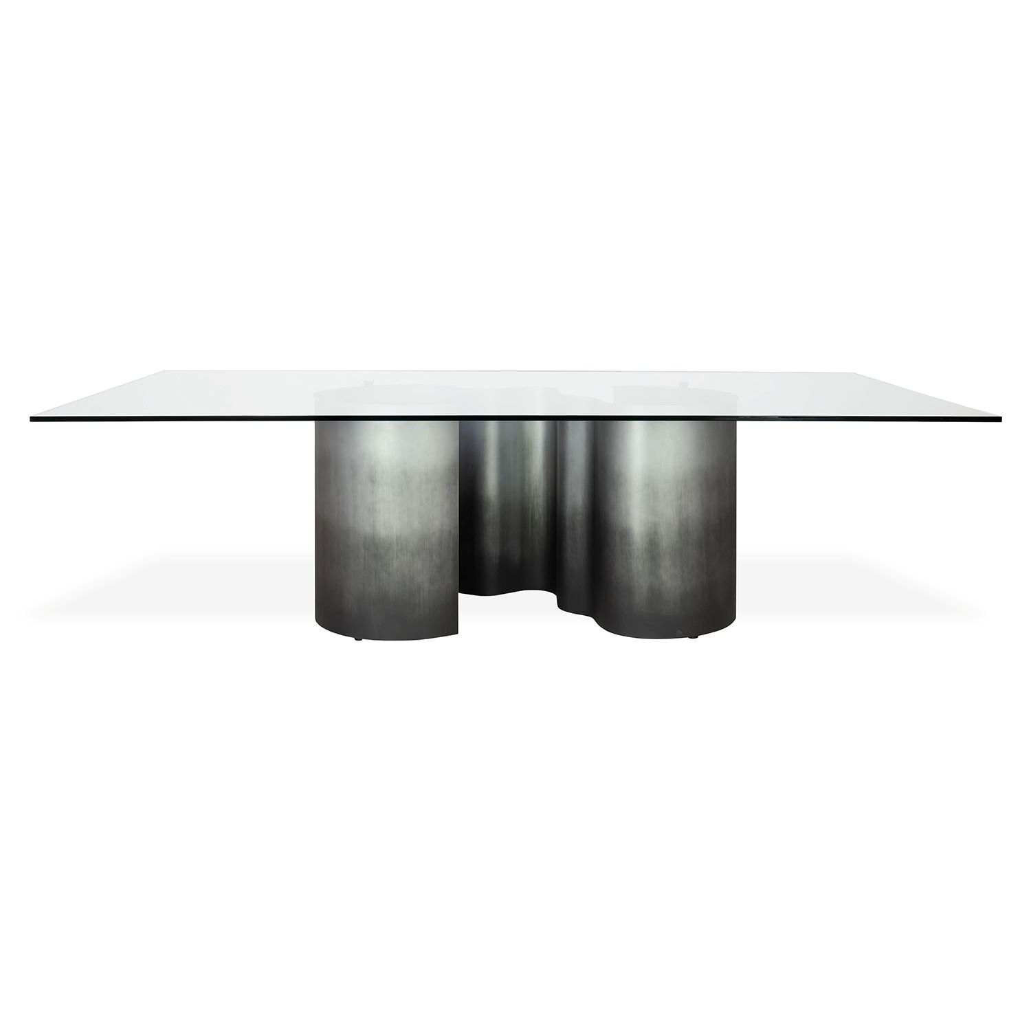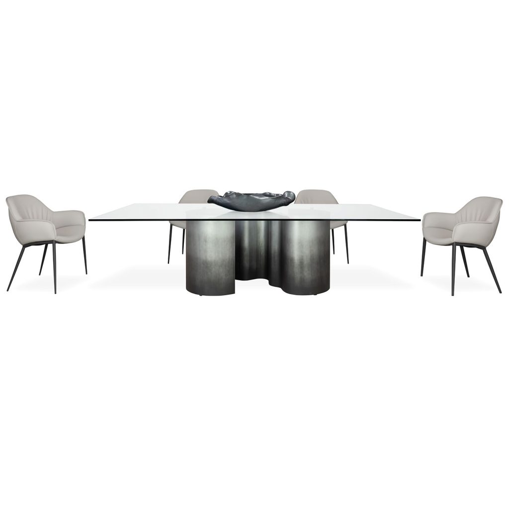 Designed by Margherita Fanti for Cattelan Italia, the Papel Dining Table radiates sculptural grace. Papel features a rectangular top in clear glass that rests on a lacquered steel base with an oxy grey finish. Inspired by ocean waves, the base is produced as one single piece and has a sinuous, organic shape whose surface reflects changes in light and shadow throughout the day.