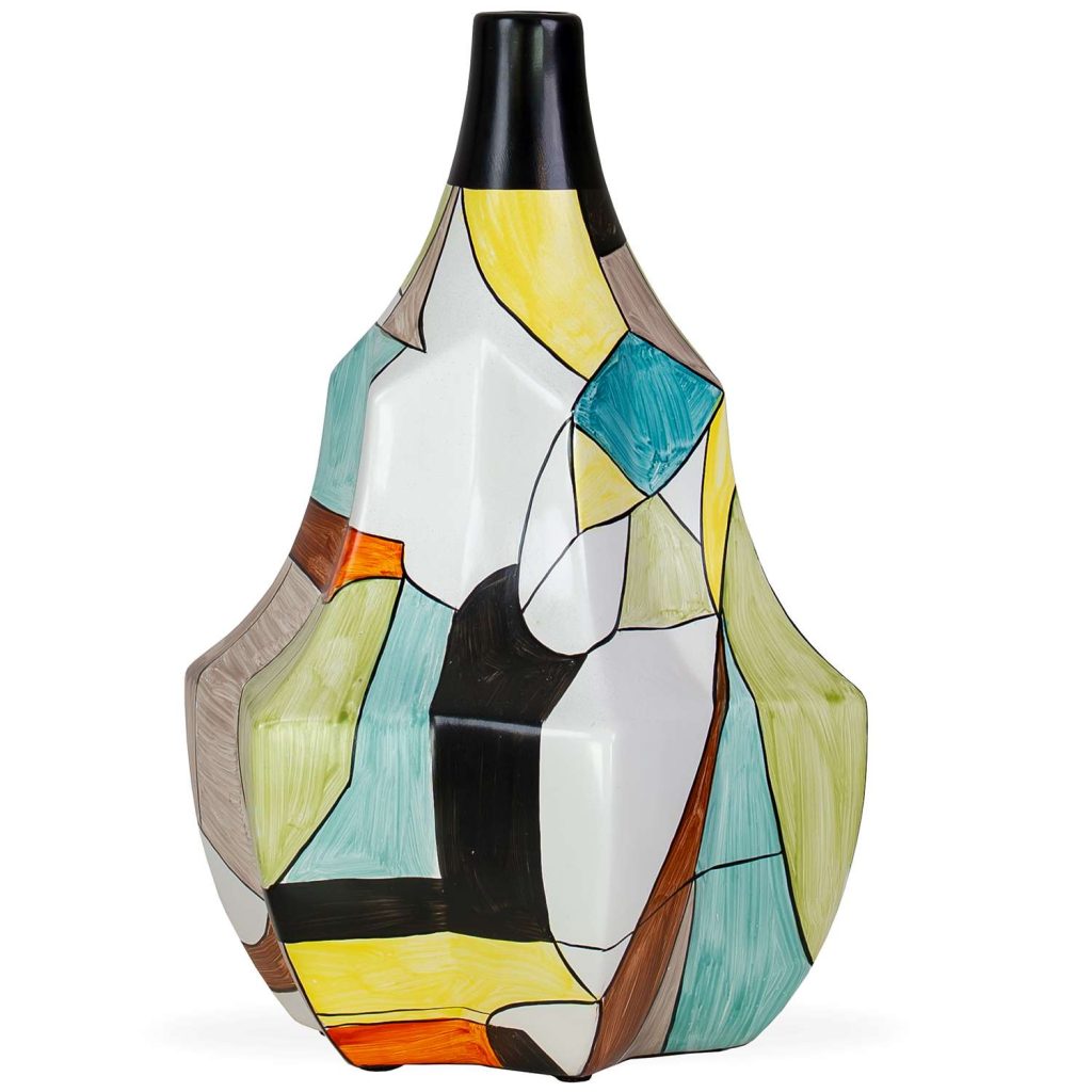 [0] => The Paressi Wide Vase is reminiscent of Cubist art, with an abstract, geometric pattern hand-painted in shades of teal, green, yellow, brown, and white. The shape of the vase adds another layer of intrigue with its angular, faceted form that tapers up to a narrow mouth. Pair with the companion Paressi Tall Vase for a captivating modern accent.