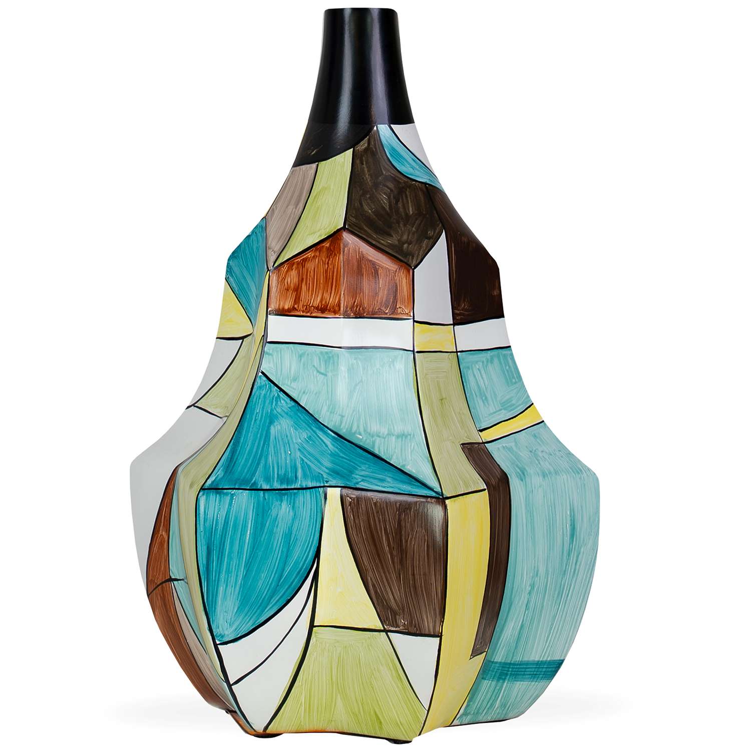The Paressi Wide Vase is reminiscent of Cubist art, with an abstract, geometric pattern hand-painted in shades of teal, green, yellow, brown, and white. The shape of the vase adds another layer of intrigue with its angular, faceted form that tapers up to a narrow mouth. Pair with the companion Paressi Tall Vase for a captivating modern accent.