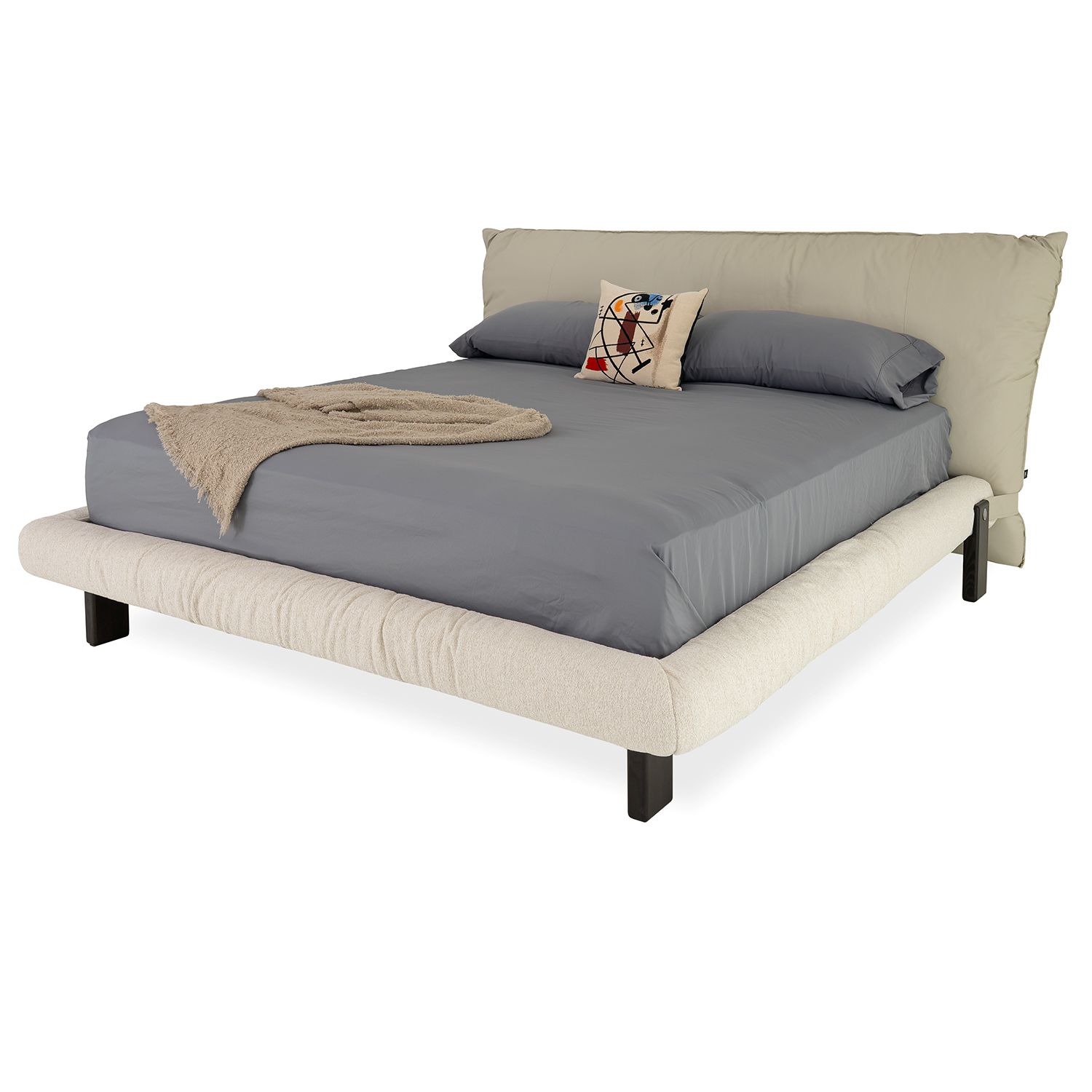 Made by Cattelan Italia, the Pascal King Bed has a stately presence with its wide, pillowed headboard and blend of luxurious materials. Ideal for resting against to read or watch TV, Pascal's headboard has a front side upholstered in beige leather and a back side in oatmeal boucle fabric. Matching fabric covers the lower frame for a look of all-encompassing softness. The headboard and frame are connected with leather straps, creating a unique look that accentuates the pillowed recess of the space between. Pascal stands on block-shaped feet with a burned oak finish and has a slatted platform construction.