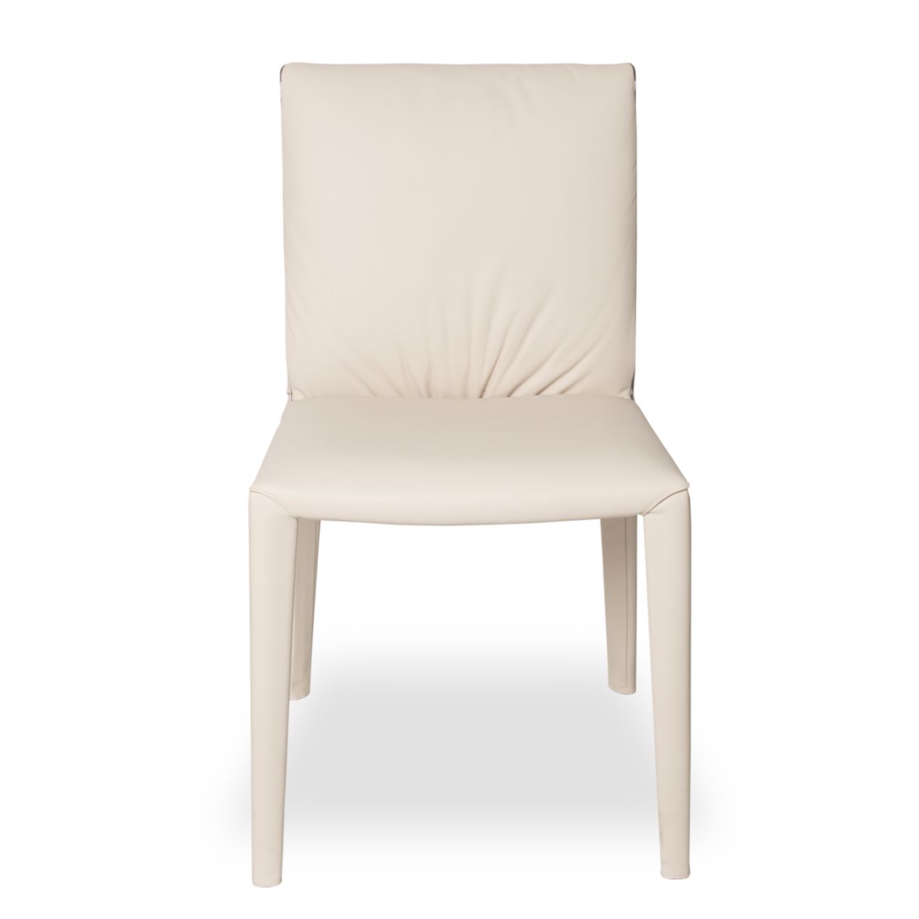 [0] => Featuring a steel frame fully upholstered in light beige leather and black chrome piping along the top of the seat, the Penelope Side Chair is minimalist and elegant. The seat back is gently curved to maximize your comfort, and the legs extend smoothly from the seat for a harmonious look. Penelope will bring timeless contemporary style to any living space, and its clean design means it pairs well with a vanity, desk, or dining table.