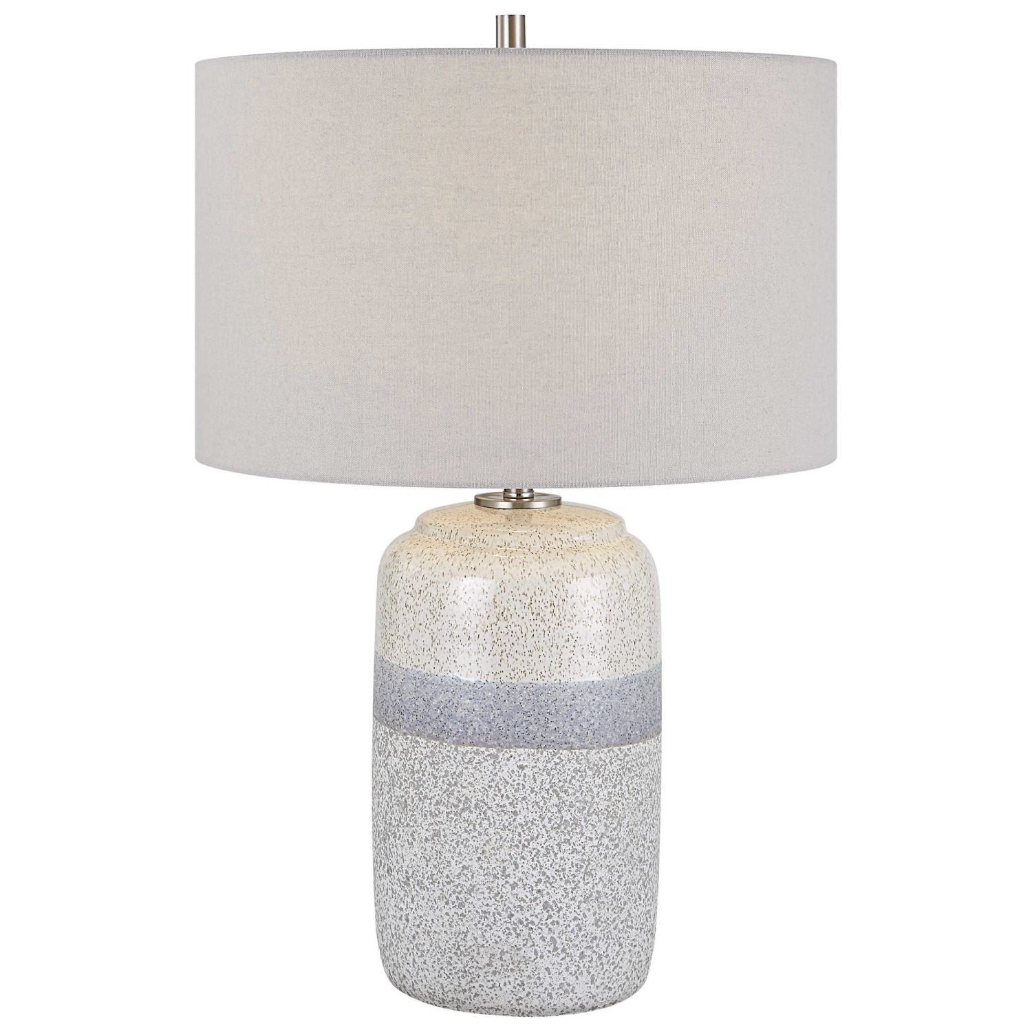 [0] => The Pinpoint Table Lamp is made from ceramic and has a rounded base decorated with speckled stripes in white, grey, and ivory for a neutral look. The drum shade is in a light grey linen for a hint of texture, and brushed nickel-plated details complete the design. Pinpoint requires a max 150W three-way compatible bulb, not included.