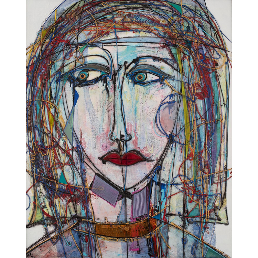 The Pondering Thoughts painting is on acrylic and features a portrait of a woman with a melancholy expression. The cool blue tones of her skin are accented by bright red lips and red and yellow accents in her hair, and the overlapping brushstrokes give the impression of texture. This painting's abstract, futuristic look brings vibrancy and emotion to any living or office space. Pondering Thoughts has a glossy finish.