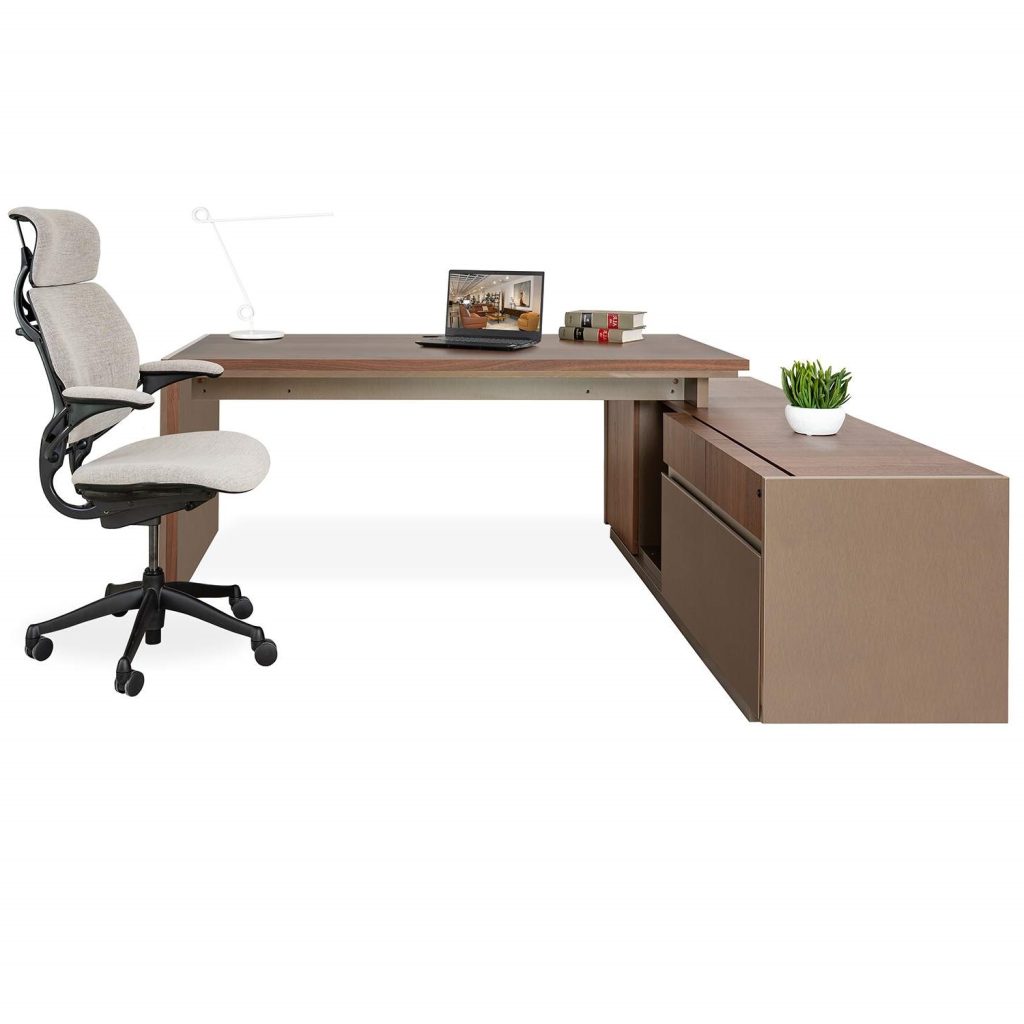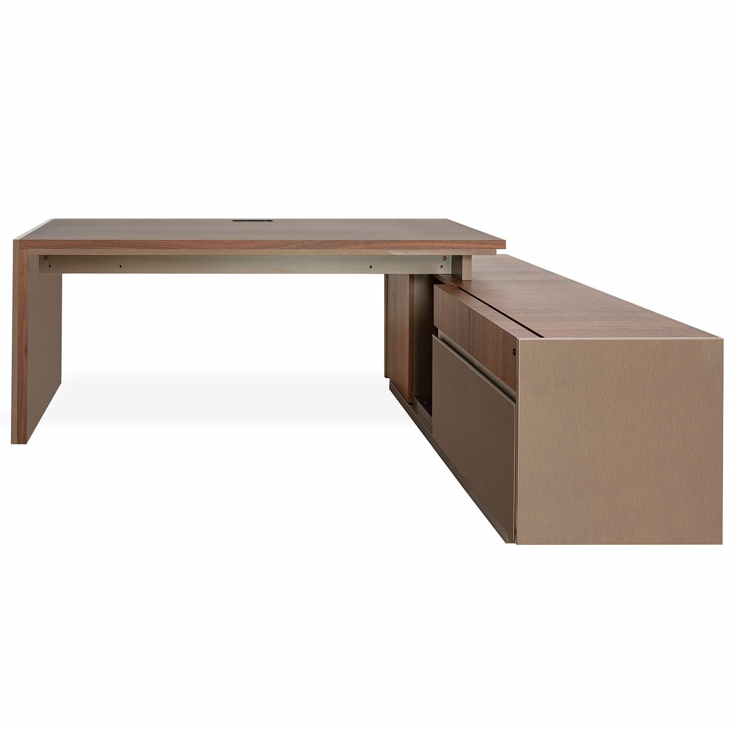 Made in Italy, the Porta Romana office collection combines warm, rich finishes to bring you a workspace that is elegant yet functional. The Porta Romana Executive Desk, available in walnut veneer with brushed bronze high gloss, is designed to complement any Porta Romana office piece. This spacious L-shaped desk with a clean-lined silhouette features a lower storage section that includes one back cabinet, two drawers, and two lockable file drawers that provide ample storage while maintaining a clean, elegant silhouette.