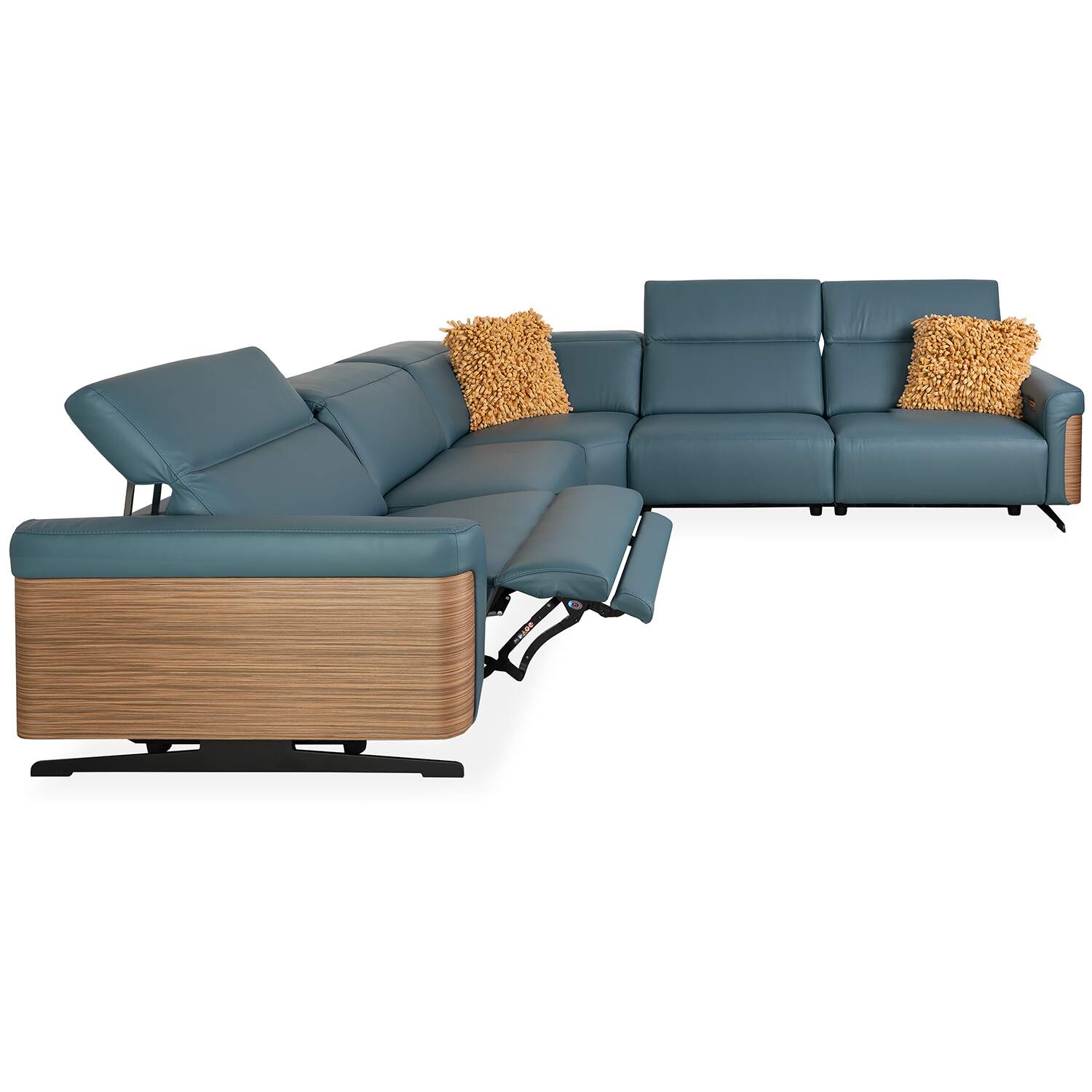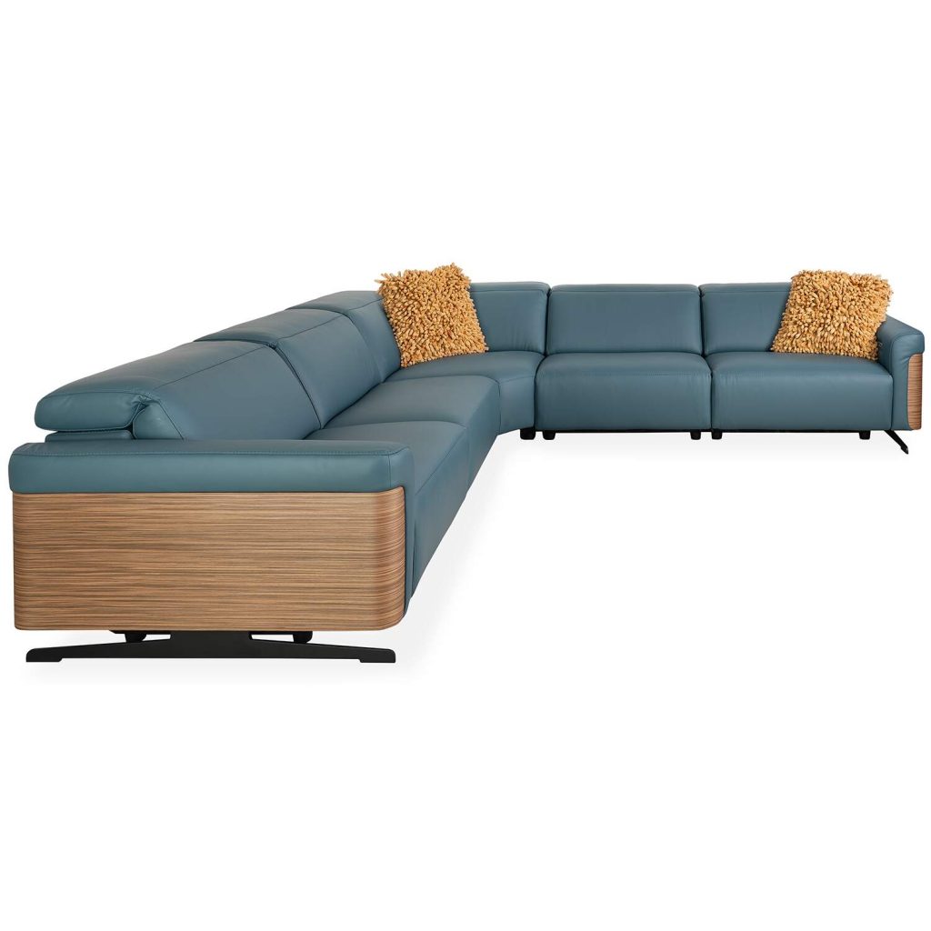 The Prato Sectional, made in Italy, has a contemporary design that plays with color, texture, and motion. Smooth Boston leather in teal is paired with warm walnut wood side panels and slim matte black legs, creating a contrasting look while remaining streamlined. Prato's three power motion seats allow you to adjust the back and leg rests to your preferred position, so you can sit back and relax. Pillows are not included and can be purchased separately.