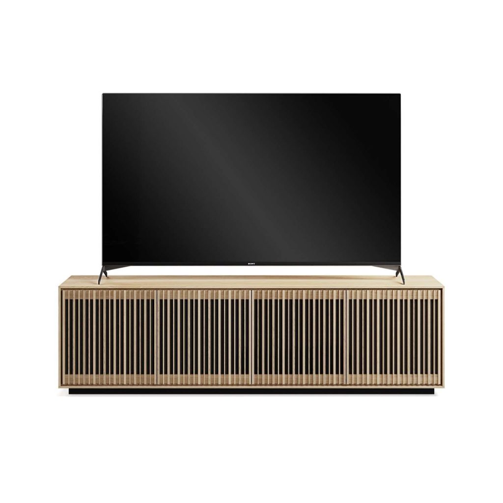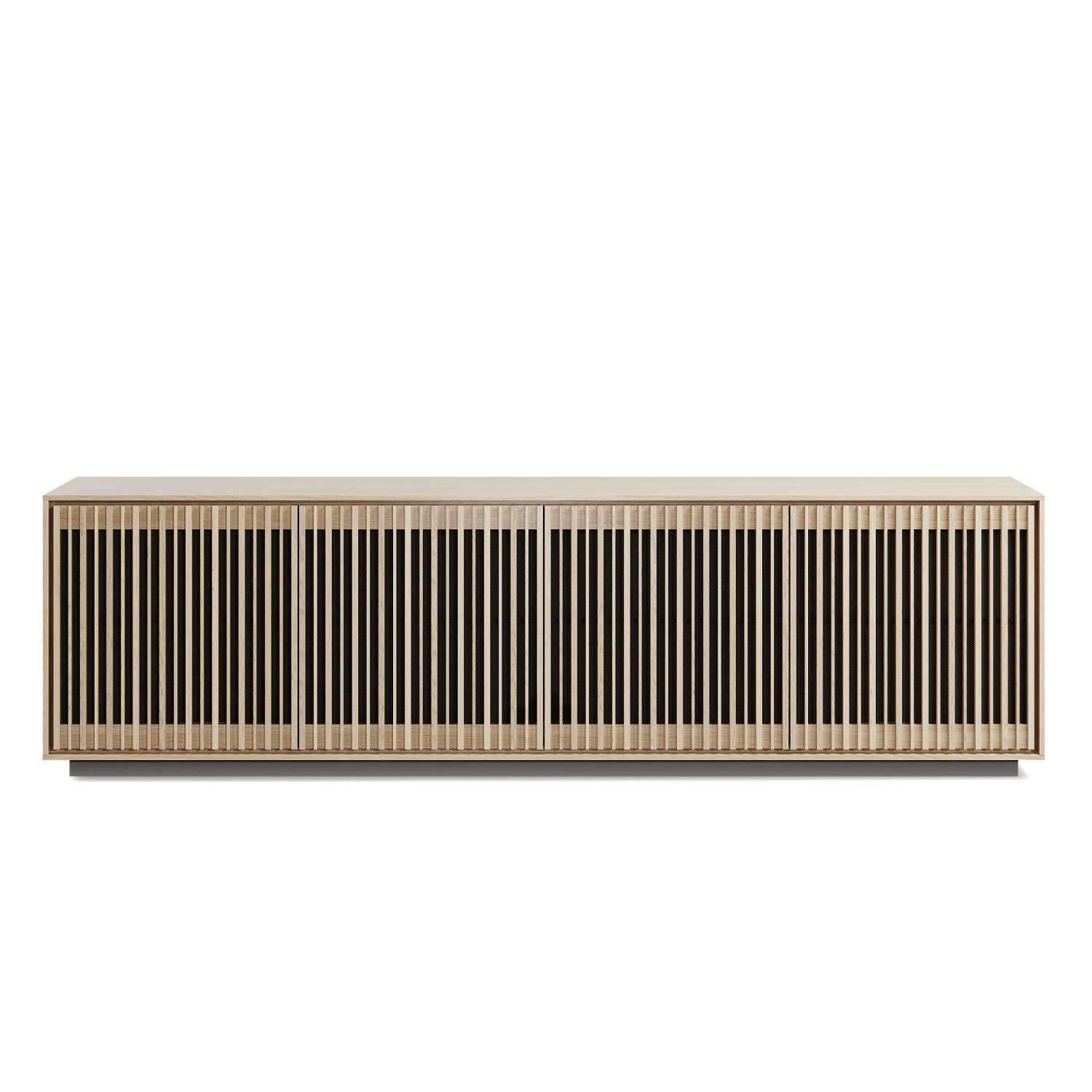 Inspired by mid-century modern design, the Profile 4-Door Cabinet blends clean lines and a washed oak finish with a plethora of intuitive features that make it fully contemporary. Both elegant and functional, Profile's slatted doors catch the eye while allowing for ventilation, acoustic transparency, and remote control accessibility. The soft-close doors conceal a larger center compartment with a soundbar shelf, and two smaller side compartments that can accommodate a variety of electronic gear. Adjustable shelving, rear access panels, wire wraps, and discreet wheels make it easy to achieve the entertainment setup that's perfectly calibrated to your preferences.