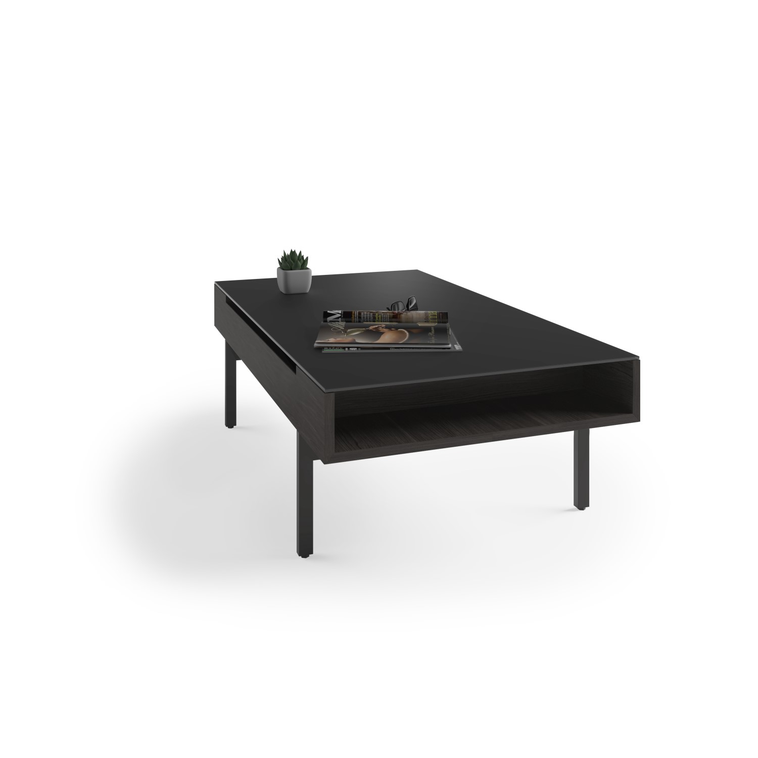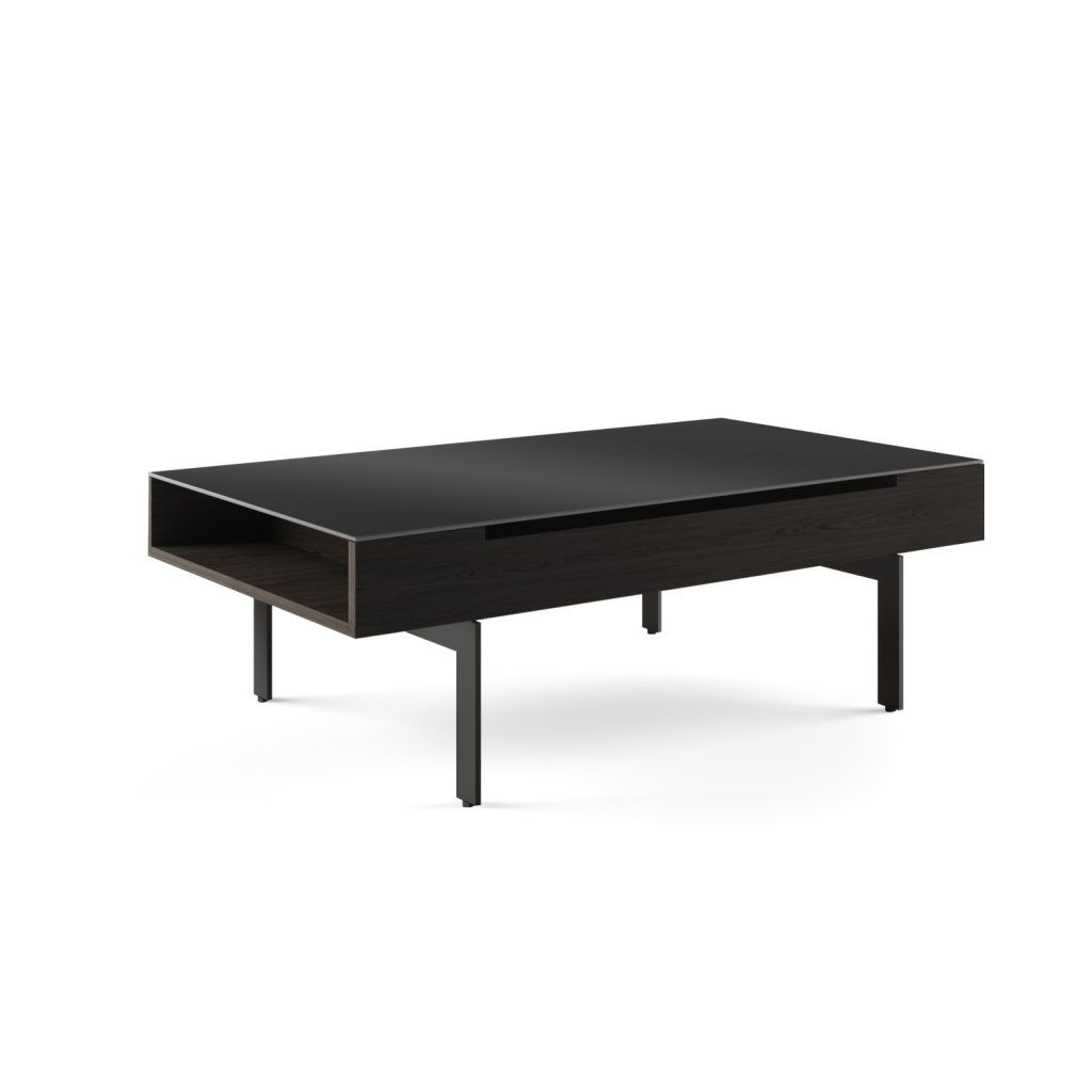 The Reveal Coffee Table by BDI, available in charcoal-stained ash hardwood veneer, is a versatile, multifunctional table with ample storage and an innovative design. The satin-etched tempered glass tabletop is equipped with a pneumatic lift mechanism that elevates the tabletop to a comfortable height for seated use and reveals a roomy storage compartment for everyday essentials like laptops, books, magazines, and more. The open side compartment is ideal for items like gaming controllers and remotes that need to be kept within easy reach. The durable steel legs have leveling feet to provide stability on any type of flooring. Reveal's sleek, stylish design and convenient features will make it the star of your living space.