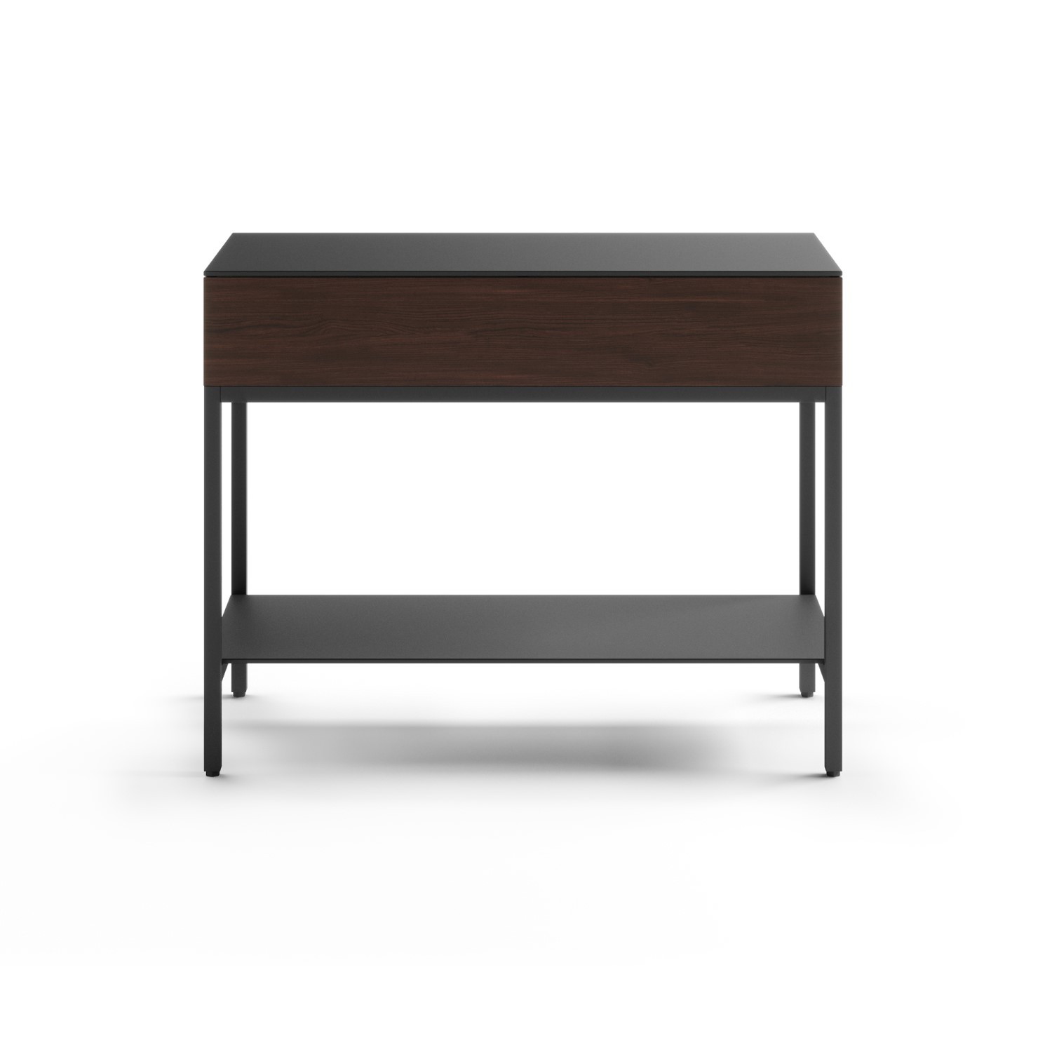 The Reveal End Table by BDI, available in chocolate-stained walnut hardwood veneer, is a versatile, multifunctional table with ample storage and an innovative design. The satin-etched tempered glass tabletop is durable and scratch-resistant, and the divided storage compartment provides concealed cable management and convenient storage for small items and electronic devices. A lower shelf offers ample room for display or storage for larger items, and the durable steel legs have leveling feet to provide stability on any type of flooring. Reveal's sleek, stylish design and convenient features will make it the star of your living space.