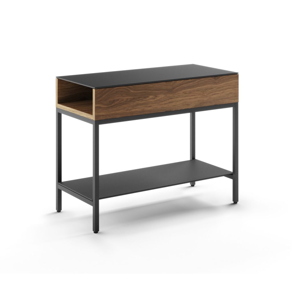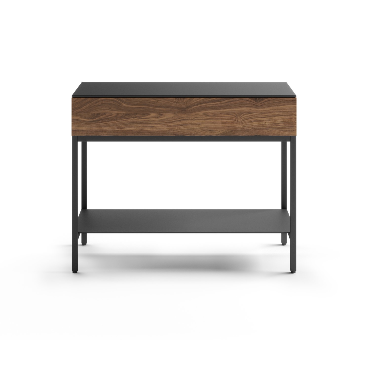 The Reveal End Table by BDI, available in natural walnut hardwood veneer, is a versatile, multifunctional table with ample storage and an innovative design. The satin-etched tempered glass tabletop is durable and scratch-resistant, and the divided storage compartment provides concealed cable management and convenient storage for small items and electronic devices. A lower shelf offers ample room for display or storage for larger items, and the durable steel legs have leveling feet to provide stability on any type of flooring. Reveal's sleek, stylish design and convenient features will make it the star of your living space.