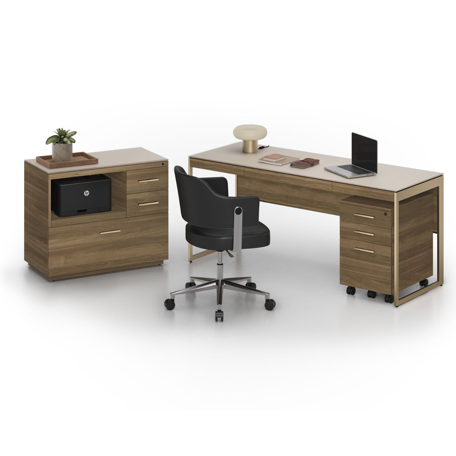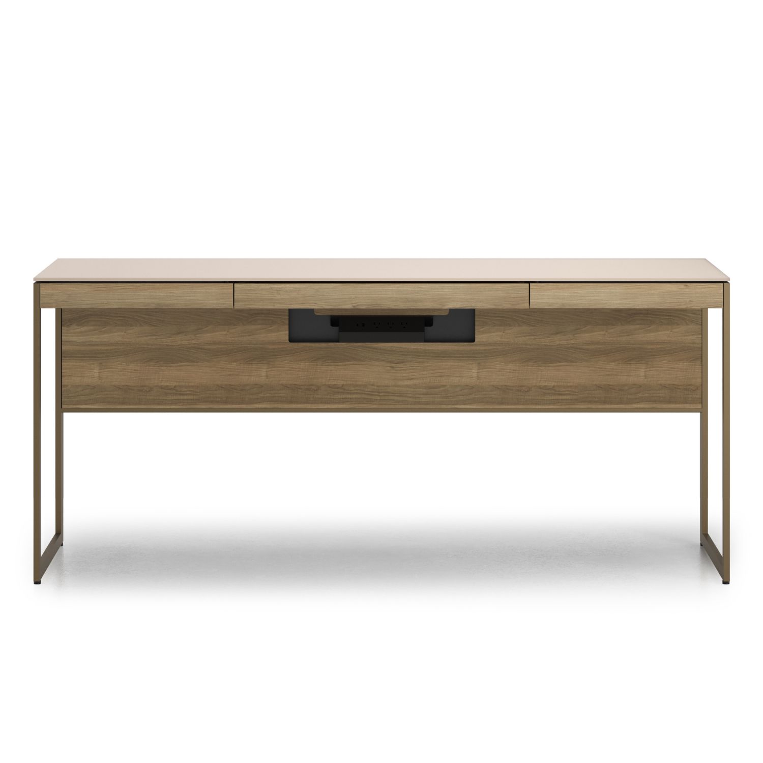 Designed by Matthew Weatherly, the Sequel Studio Desk forms the foundation of the BDI Sequel Studio office collection. Sleek and refined, this desk pairs a beige satin-etched glass top with a durable body in neo walnut veneer, accentuated by bronze-finished legs. A drawer with a flip-down front can support a keyboard and mouse as well as store everyday essentials. The tilting cable management panels offer direct access to an integrated power strip with outlets and USB connections, while wire straps keep cords out of sight, so the work surface stays composed.