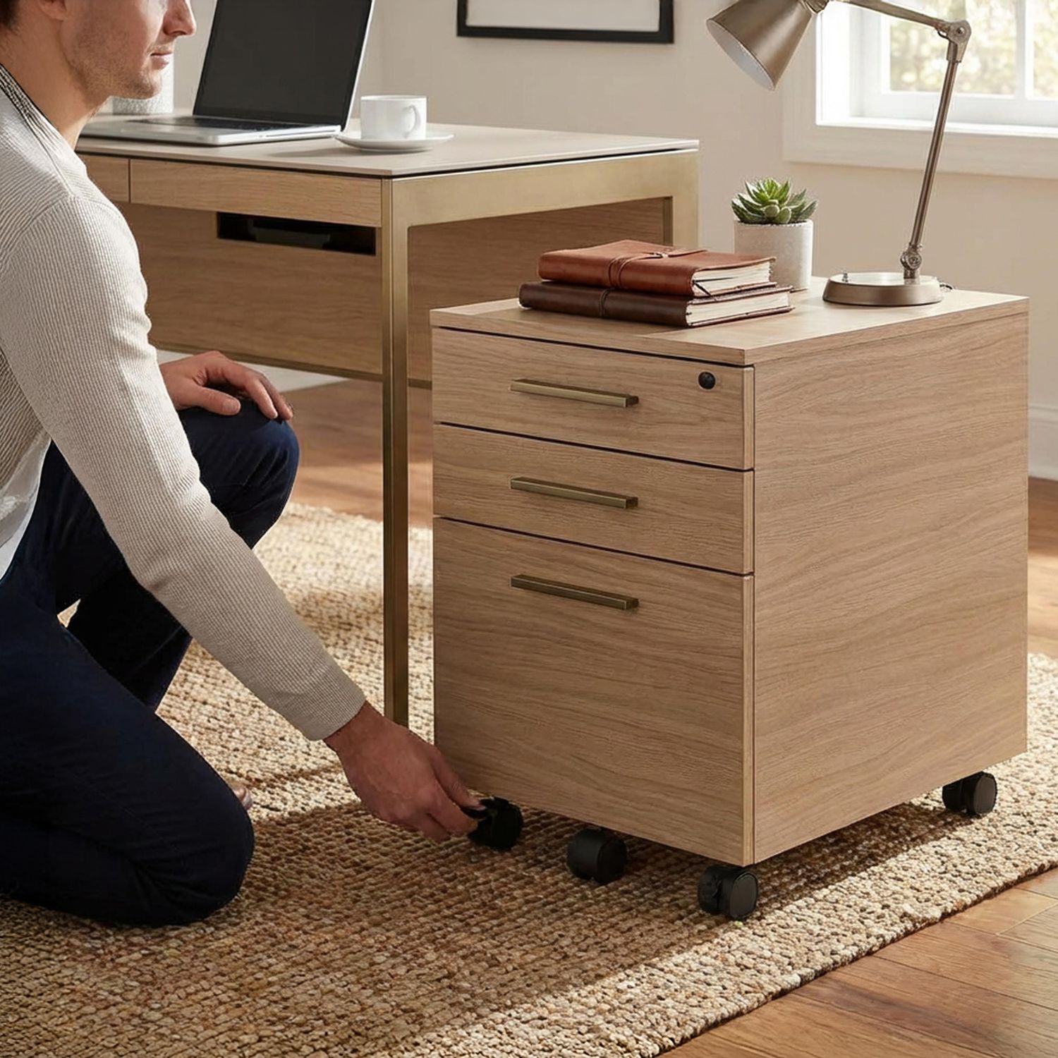Designed to tuck perfectly beneath the Sequel Studio Desk, the Sequel Studio Mobile File Pedestal delivers compact, secure office storage that rolls to wherever the work is. Sleek and refined, this pedestal has a durable body in neo oak veneer accentuated by bronze-finished drawer pulls. Two upper drawers help organize supplies, while a lower drawer accommodates letter or legal files. All three compartments can be secured together through a single lock. Lockable casters let the pedestal move easily between workstations and hold firmly in place when set.