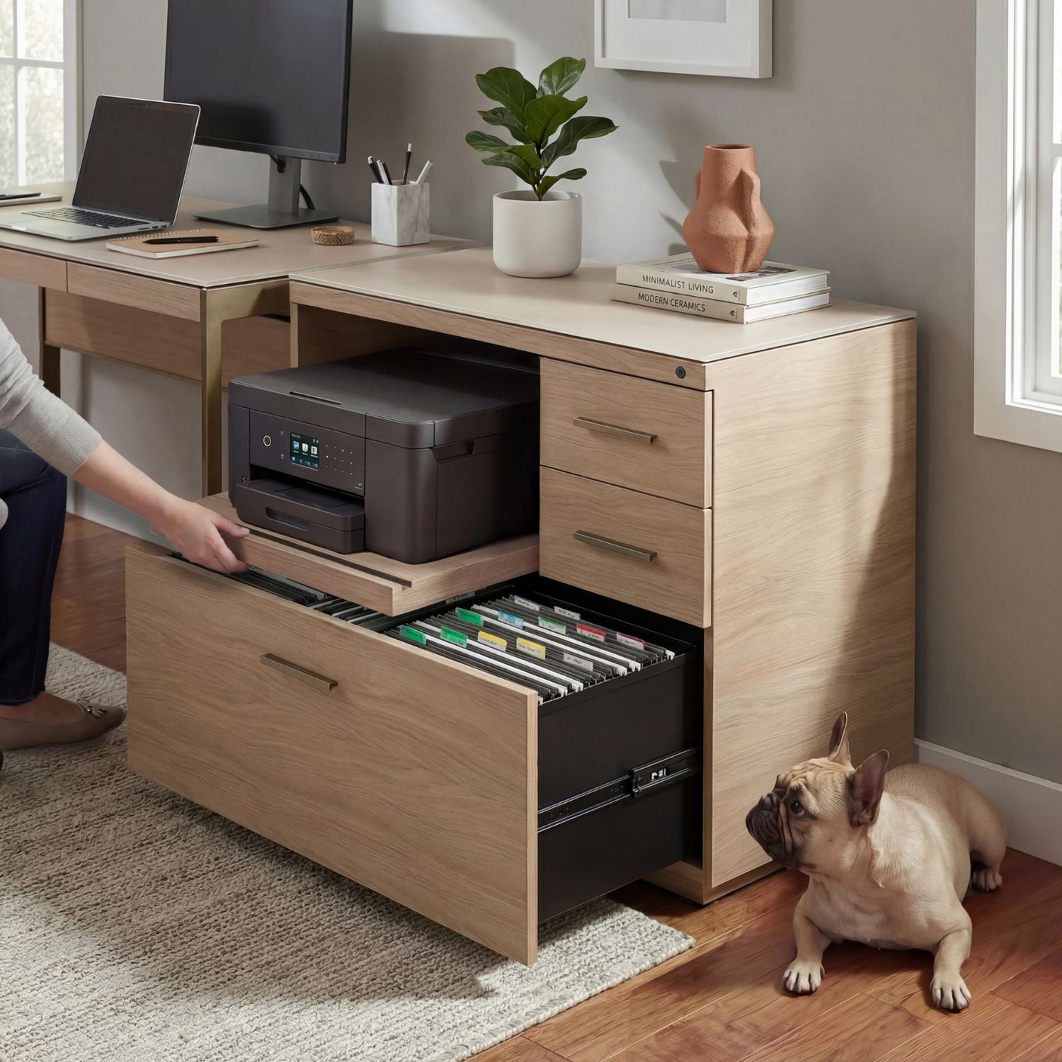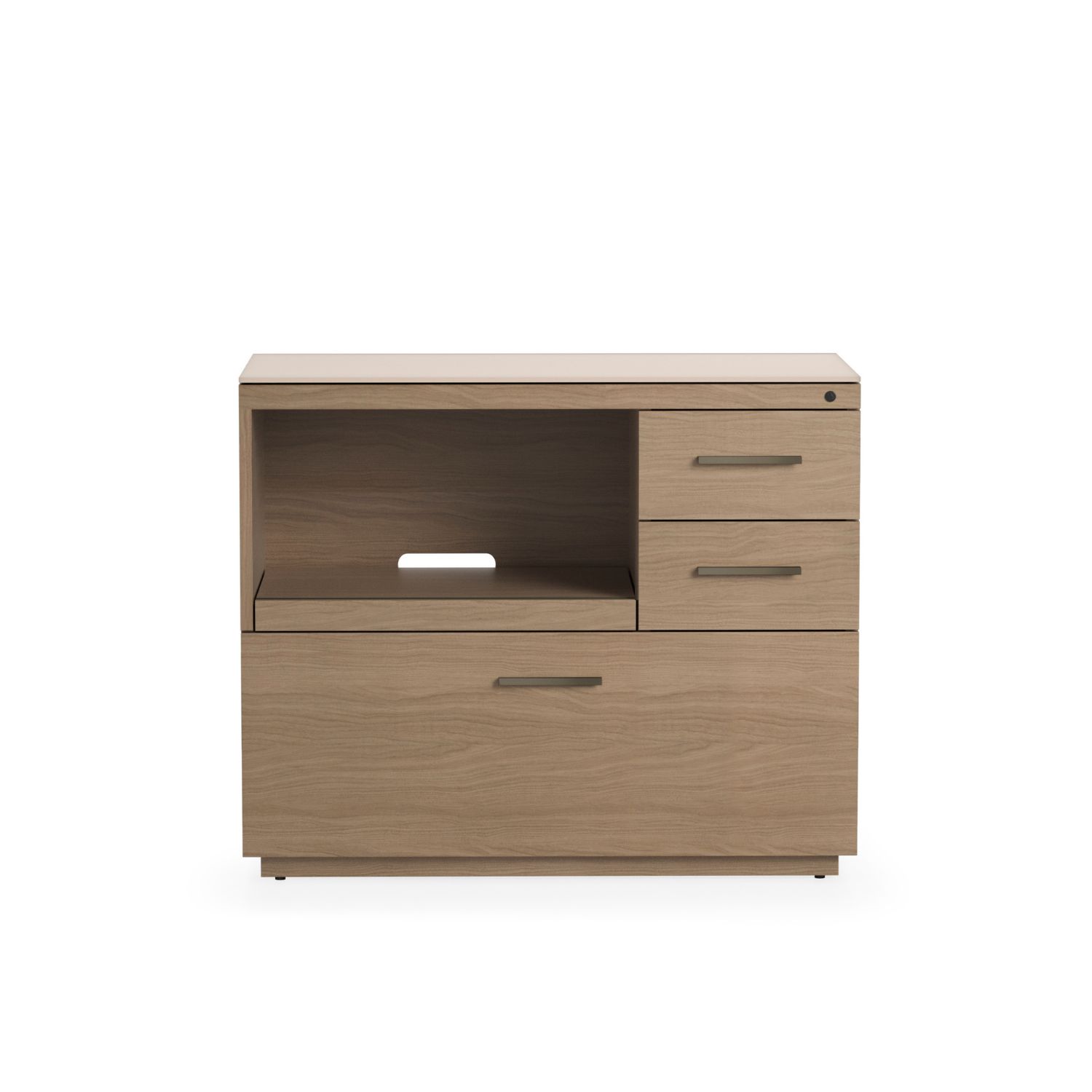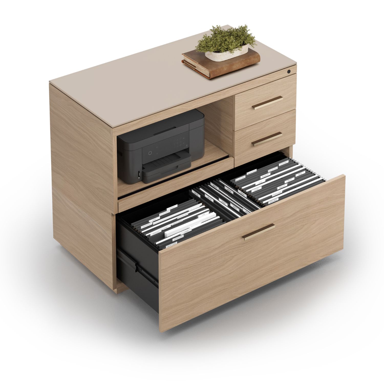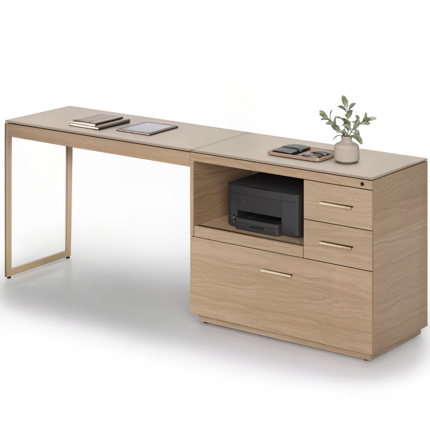 The Sequel Studio Multifunction Cabinet gathers your printer, files, and office essentials into a single streamlined station. Sleek and refined, this cabinet pairs a beige satin-etched glass top with a durable body in neo oak veneer, accentuated by bronze-finished drawer pulls. An open compartment with a sliding tray keeps a printer accessible, while two utility drawers and a full-extension letter-and-legal file drawer secure together through a single lock. The Sequel Studio Multifunction Cabinet can anchor a Sequel Studio Return on one or both sides for a solo or multi-person workstation.