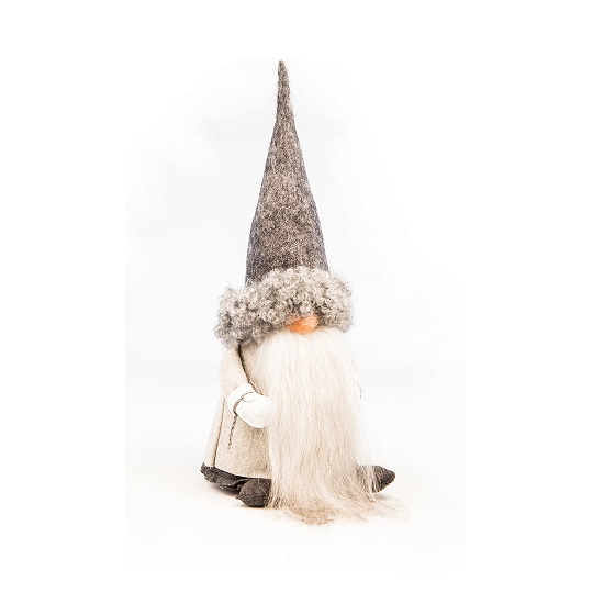 Handcrafted in Sweden, Sigvard the tomte is a cheerful holiday companion who brings joy and a smile to the face with his cute hat, fluffy beard, and unique personality. Sigvard is crafted from the curly wool of the Gotland sheep, which, using water and soap, is made into felt for his robes and nose. His beard is also sheep's wool. A tomte, also known as a "nisse" in Denmark and Norway, is a domestic spirit who helps to ensure the protection and well-being of the household.