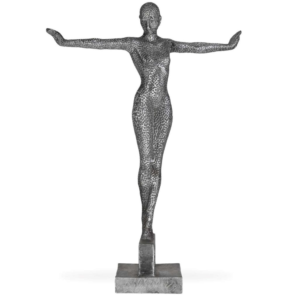 The Stretched Out Hand Sculpture depicts a figure with their arms outstretched to either side, standing on tiptoe on a beam-like structure. A dotted pattern covers the body of the statue, adding a sense of texture and an edgy, avant-garde twist. Made of aluminum, the Stretched Out Hand Sculpture comes with a rectangular base and is suitable for indoor or outdoor use.