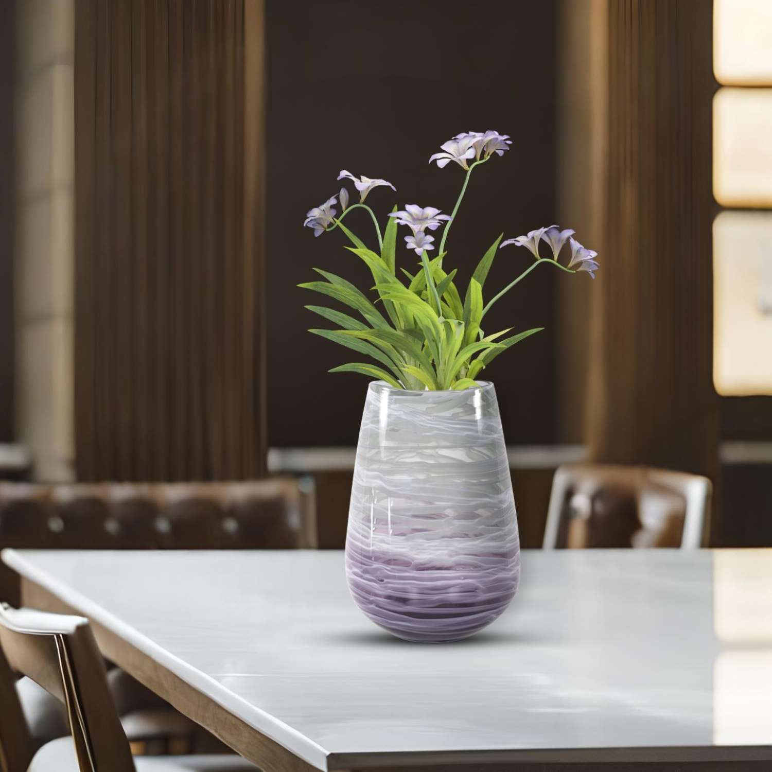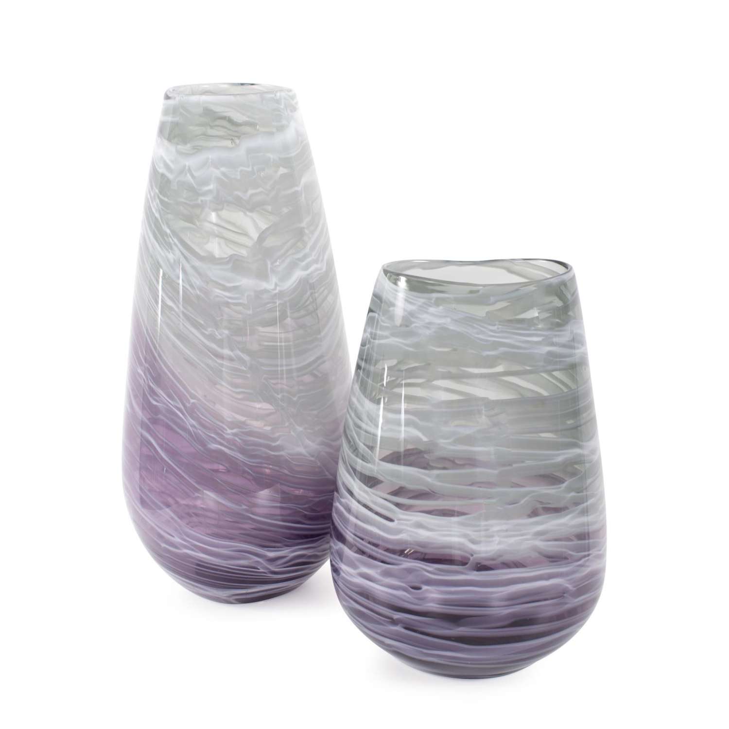 [0] => The Swirled Torpedo Short Vase is hand-blown from glass in a teardrop shape with a wide mouth. Its soft hues of lavender and grey are accented with a dreamy, swirled pattern in white that infuses this piece with a calm yet dynamic feel. Fill with flowers or pair with the Swirled Torpedo Tall Vase to add a delicate touch to your interior.