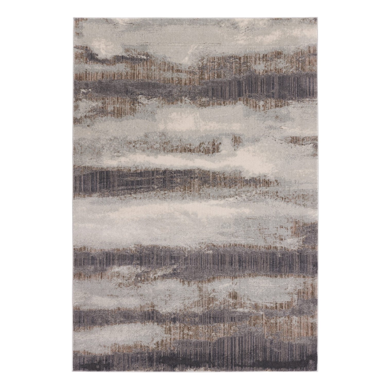 The Taos Mirage Rug features earthy shades of grey and brown in an abstract, partially striped pattern with a textured high-low pile. Woven in Turkey from a blend of fris polypropylene and micro polyester, the Taos Mirage Rug is durable enough for any area of the home. Place it in your living room, entryway, or bedroom for a harmonious accent piece that evokes a landscape covered with clouds or mist.