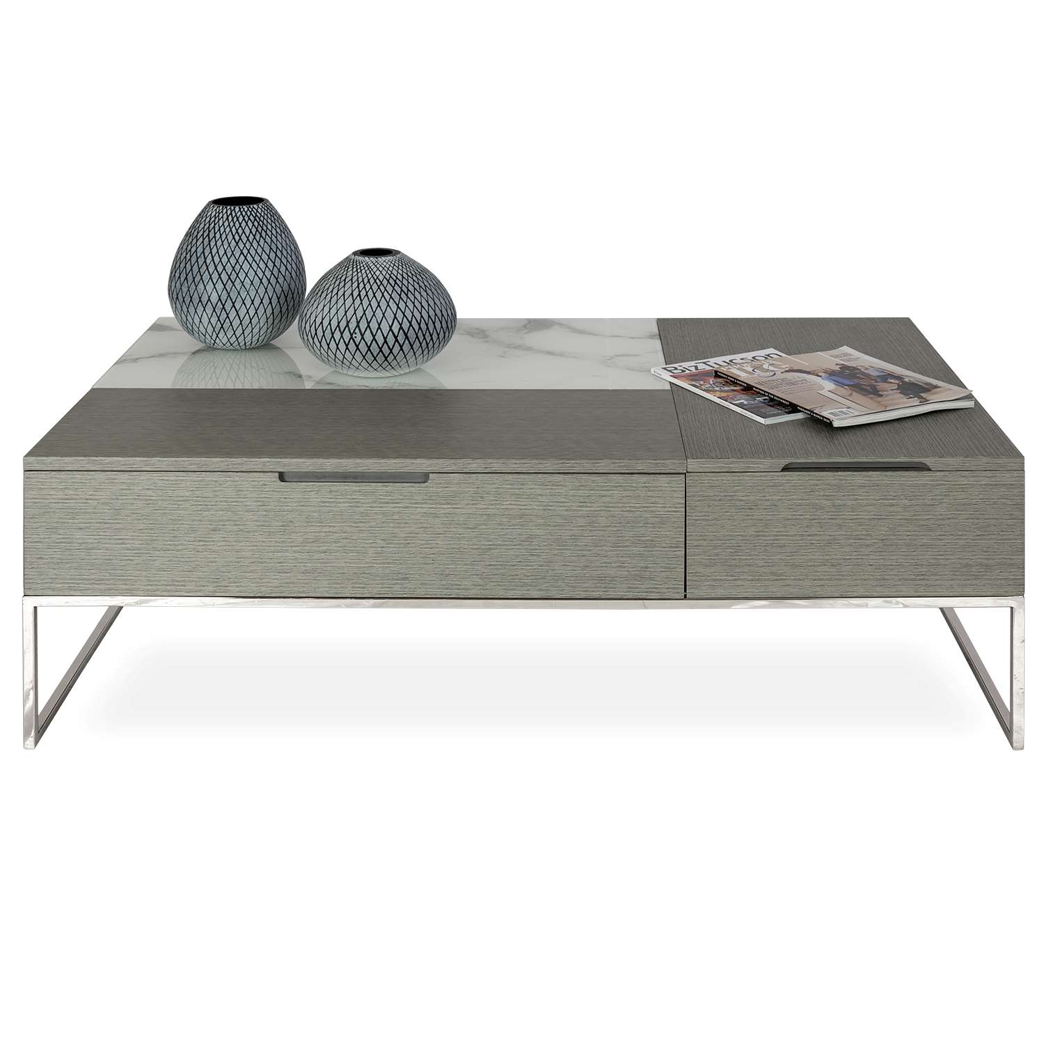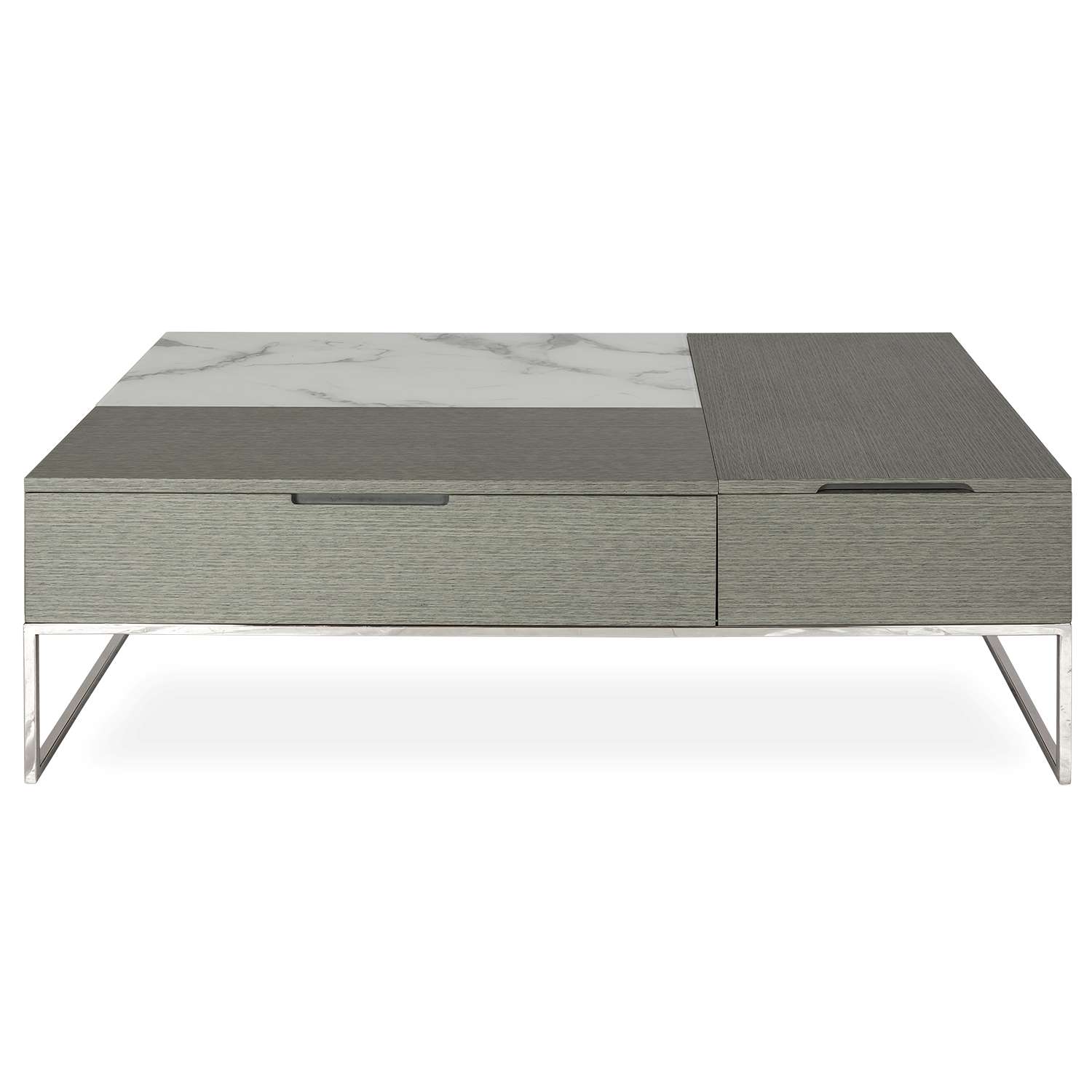 [0] => tetris dual lift up top coffee table winter grey. carrara marble top. high polished stainless steel leg base. 1 drawer and under table storage. 47x27x15h glfa