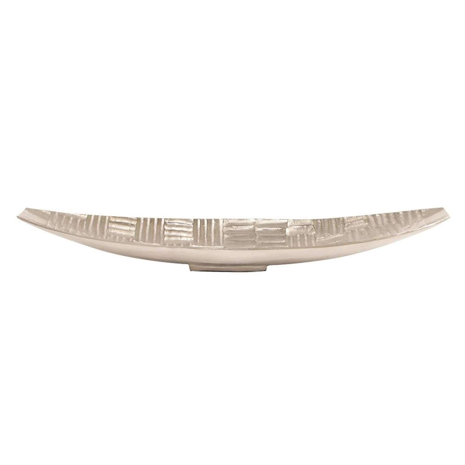 [0] => Made from aluminum with a silver finish, the Textured Elongated Silver Bowl features a chiseled crosshatch pattern and a graceful, boat-like shape that curves upward at the ends. While not food-safe or watertight, this bowl still makes a great centerpiece for a dining table or a bold accent for a sideboard or console table.