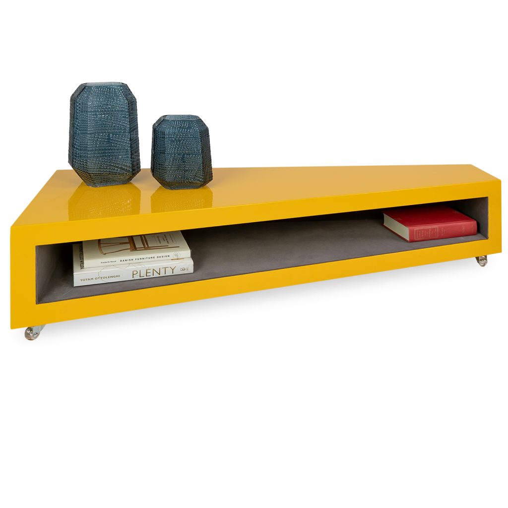 [0] => trojan coffee table / lower triangular unit b only, open shelve space, hidden castors, unit 51w 22/8d 10h, yellow high gloss