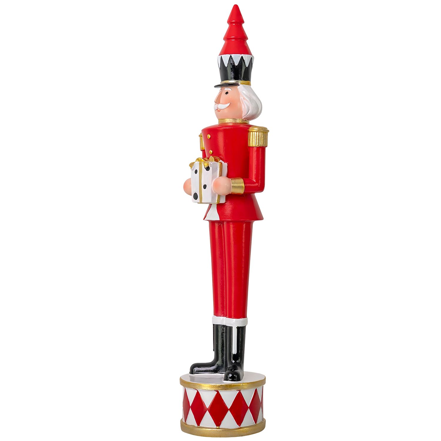 [0] => The Twinkle Troop Soldier comes bearing gifts this holiday season. Standing atop a drum, this figurine has a festive color scheme in red, white, gold, and black, and holds a present while balancing a tree atop his head. Pair with the other Twinkle Troop Soldiers for a cheerful holiday trio.