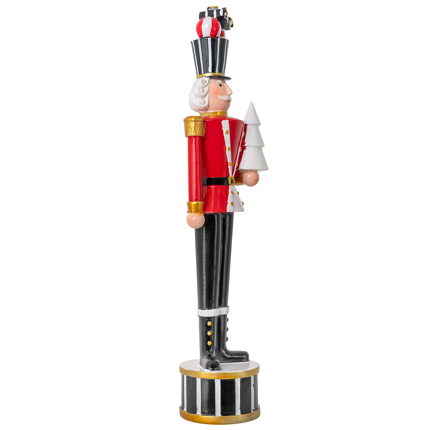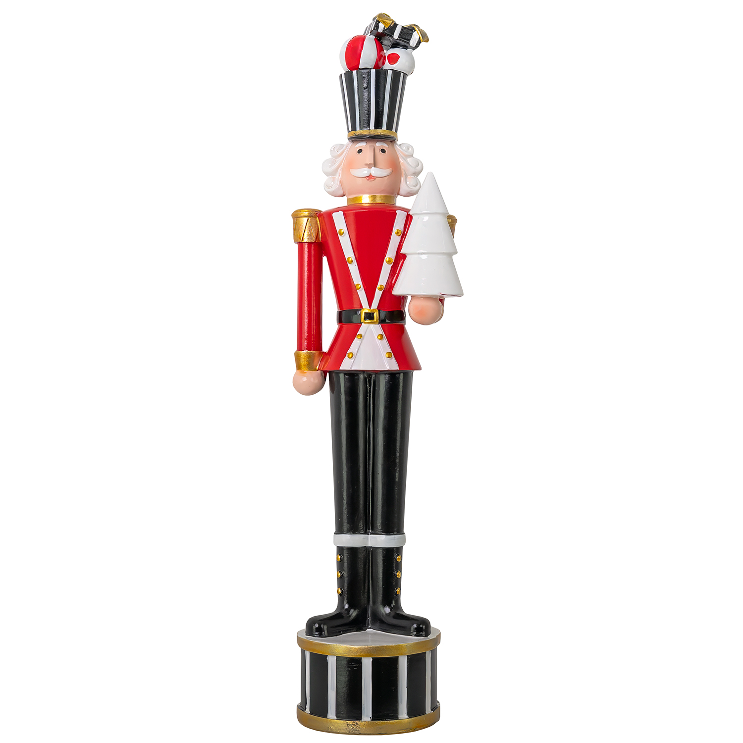 [0] => The Twinkle Troop Soldier comes bearing gifts this holiday season. Standing atop a drum, this figurine has a festive color scheme in red, white, gold, and black, and holds a tree while balancing a gift box atop his head. Pair with the other Twinkle Troop Soldiers for a cheerful holiday trio.