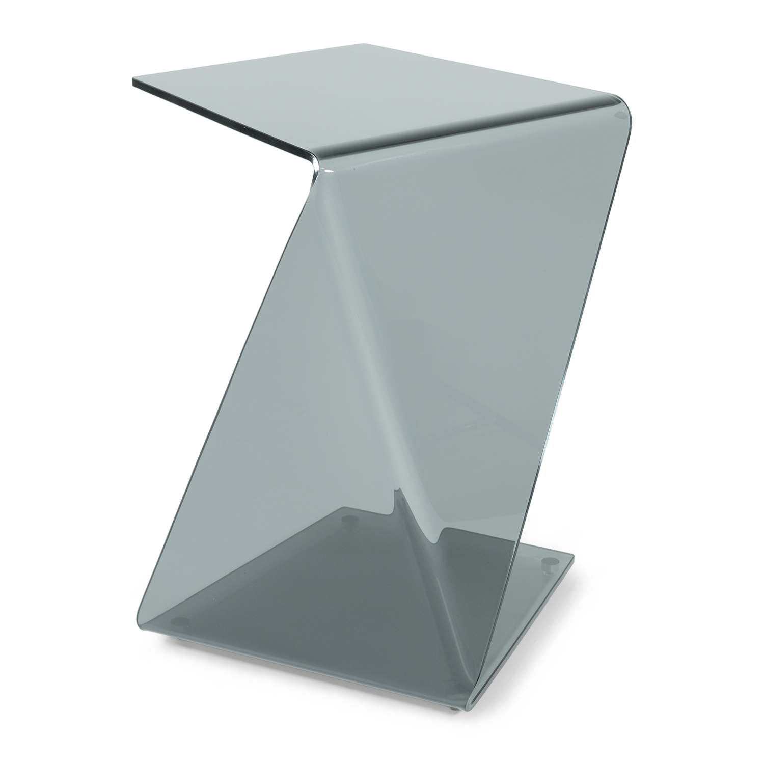 Accent your living or office space with the Twister Side Table. Black tinted glass smoothly bends to form a z-shaped table with crisp, sleek edges. Steel floor supports anchor Twister, while its open structure allows it to easily fit into a multitude of spaces.