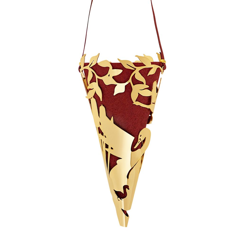 Bring Danish charm to your home for the holidays with the Ugly Duckling Cone Ornament. Made of 18-karat gold-plated brass with a polished shine and delicate cut-out sections, this ornament references the Hans Christian Andersen fairytale "The Ugly Duckling." This ornament's conical shape lets it carry small trinkets, candies, or sprigs of greenery, and it comes with a red felt lining and red ribbon for hanging.