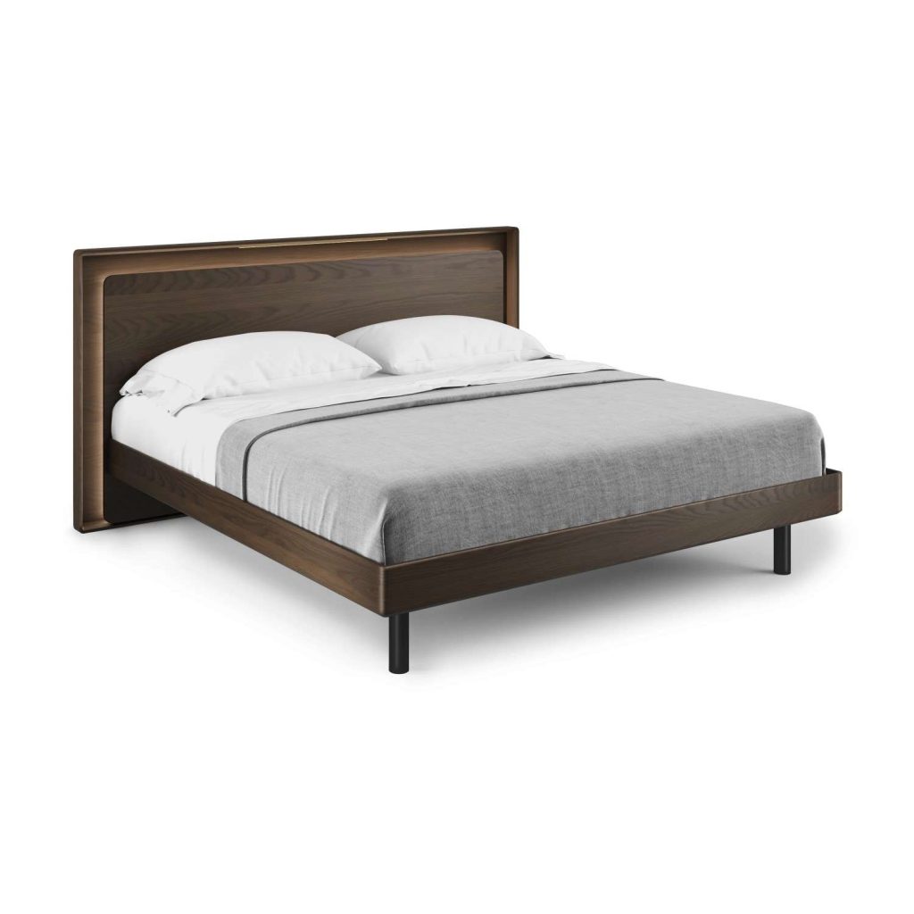 Designed by Matthew Weatherly for BDI, the Up-Linq King Bed combines an elegant mocha veneer with cutting-edge features made to fit your modern lifestyle. Up-Linq's headboard has a floating front panel that hides an ultra-convenient power station on both sides of the frame. With three outlets, a USB-A port, and a USB-C port on each side, both you and your partner can charge devices, keep a lamp plugged in, and stay connected from the comfort of your bed. Dimmable accent lights and an LED touchbar in the headboard create the perfect mood lighting.