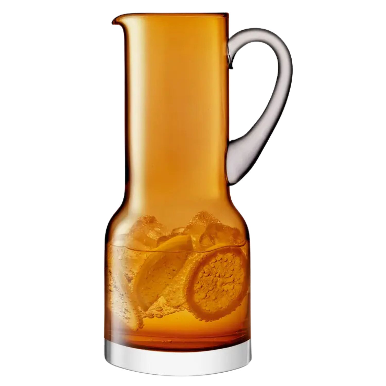 The Utility Jug is made of mouth-blown glass in amber brown and features a modern stepped shape with thick walls, a soft, melted rim, and a clear handle. Perfect paired with the matching Utility tumblers and highball glasses, this jug can elegantly hold a variety of beverages for everyday use or special dining occasions.