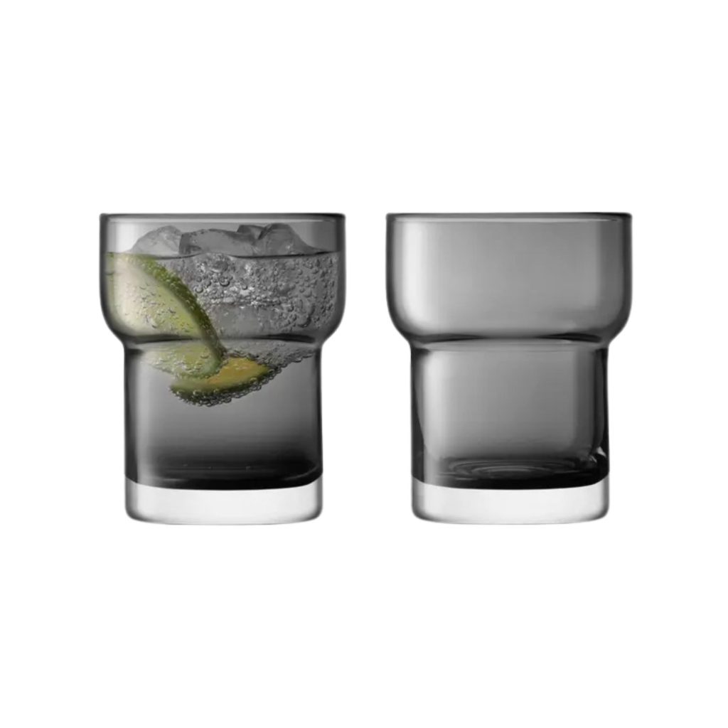 [0] => The Utility Tumblers are made of mouth-blown glass in slate grey and feature a modern stepped shape with thick walls and a soft, melted rim. Sold as a set of 2, these glasses can elegantly hold a variety of beverages for everyday use or special dining occasions.