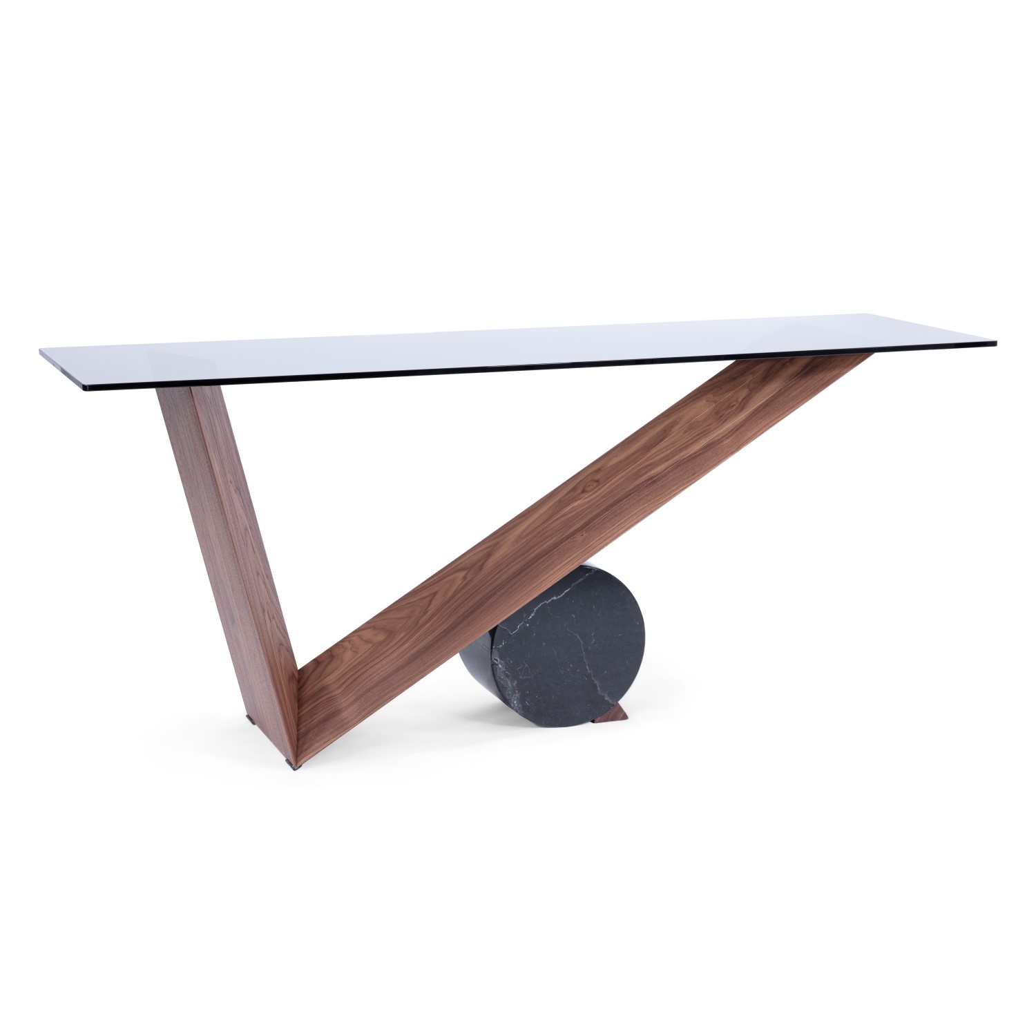 The Valentino Console Table, made in Italy, features a dynamic silhouette with an asymmetric V-shaped walnut base, a rectangular smoked glass top, and a black marble cylinder with grey veining. The rich tones and sharp angles of the walnut base are enhanced on either side by the grey glass and sleek dark marble for a stylish, sophisticated composition. Perfectly balanced, Valentino's sculptural design makes an eye-catching addition to any living space.
