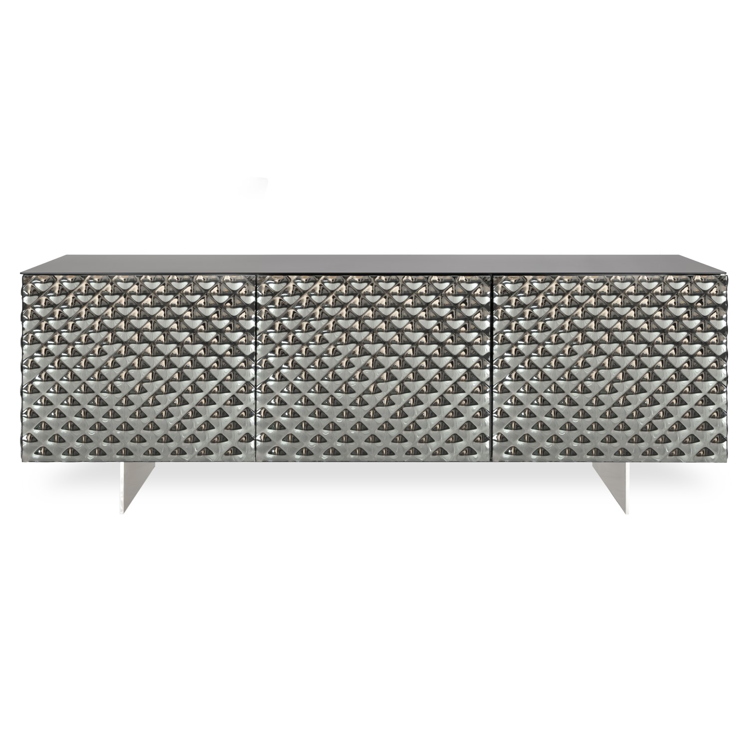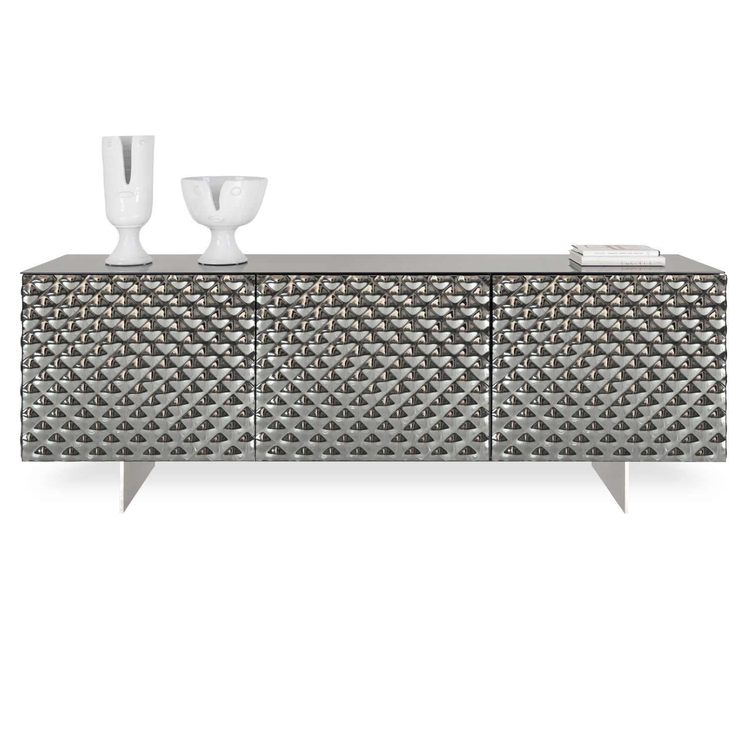 Designed by Paolo Cattelan and Lorenzo Remedi, the Vivaldi Sideboard is a breathtaking work of contemporary Italian artistry. Vivaldi's front and sides are overlaid with smoked grey mirrored and quilted glass that gives off a brilliant, multi-faceted shine. Matching mirrored glass covers the top of the sideboard, creating an elegant reflective surface. Functional as well as beautiful, Vivaldi also features stainless steel legs, interior glass shelves, and an optional drawer that mounts behind the center door to keep cutlery, bar tools, and other small items organized.