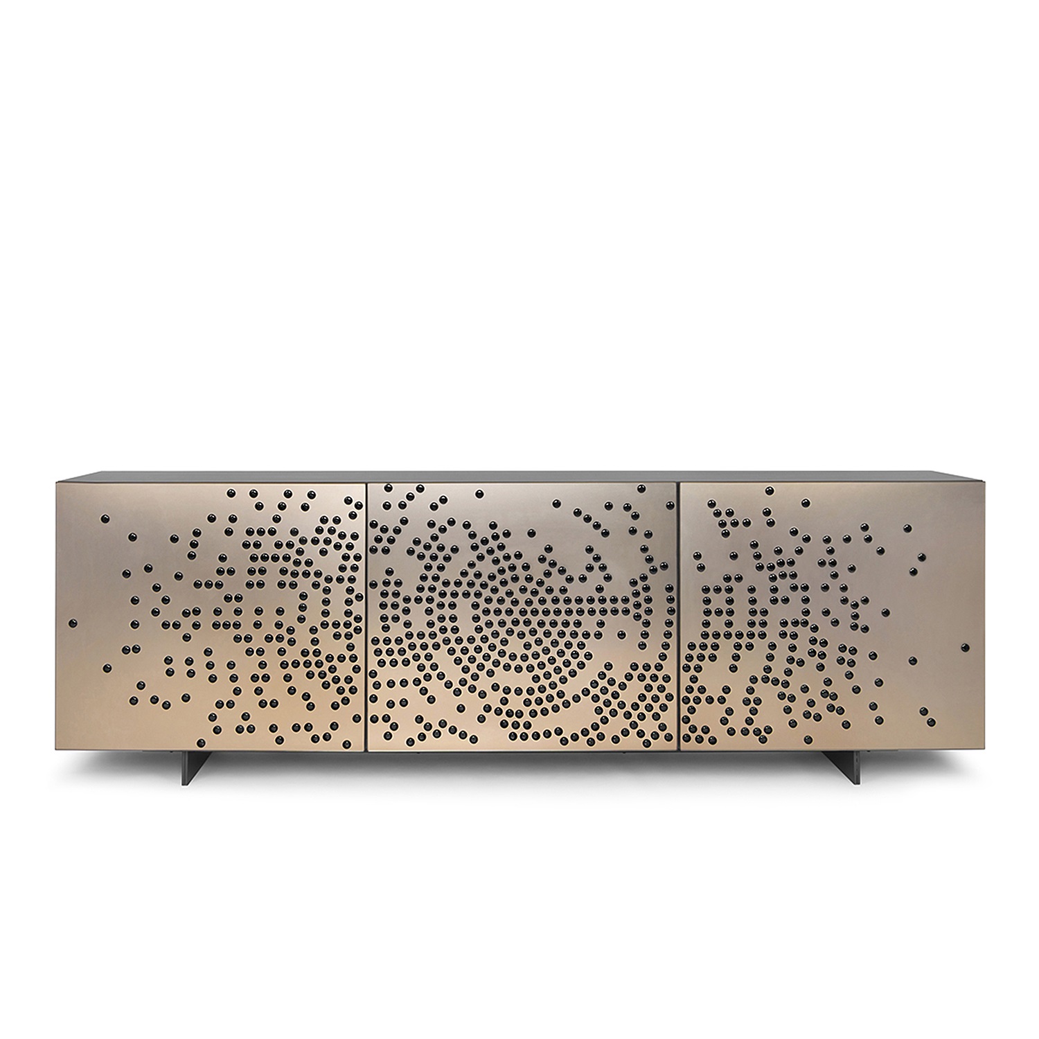 The Voyager Sideboard is a marvel of contemporary design, featuring matte graphite wood cabinets and stunning doors in frosted bronze glass with glossy black studs that stand out in relief. Voyager's front panels boast a constellation pattern that instantly catches the eye -- at once intentional and abstract in its arrangement. Voyager has three roomy cabinets for storage and is both artistic and functional.