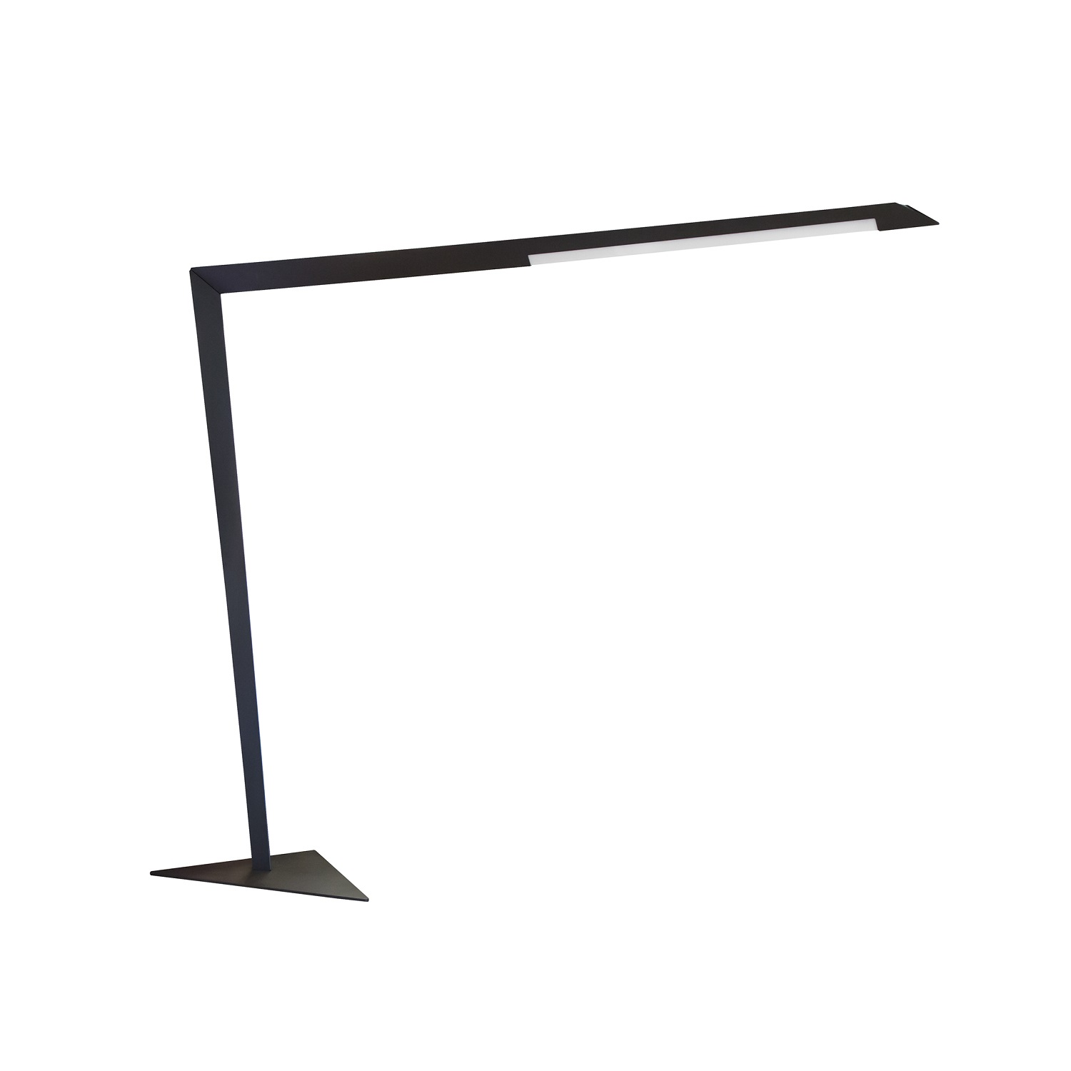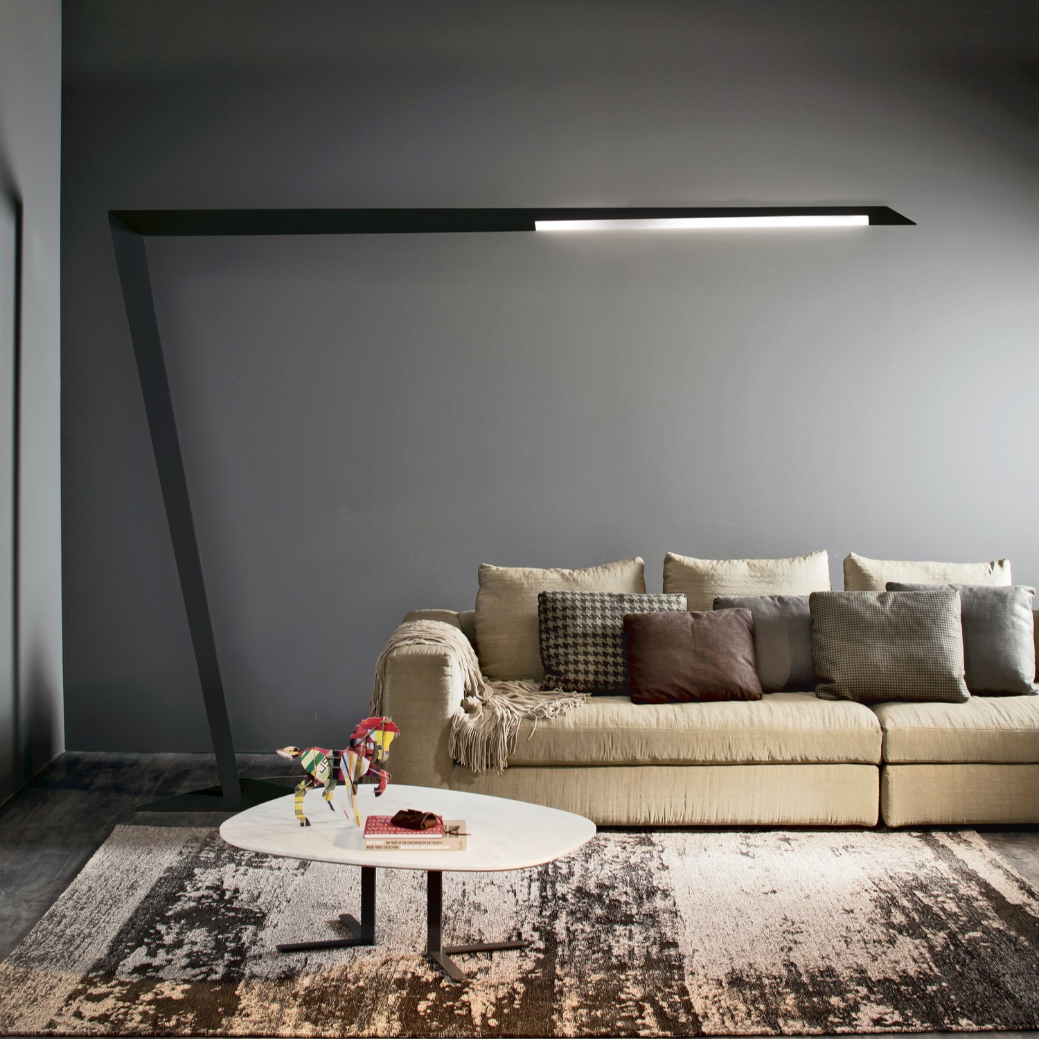 The Zed Floor Lamp, made in Italy by Cattelan Italia and designed by Philip Jackson, has a sleek, contemporary look, with an angled, geometric silhouette and a graphite embossed steel frame. The flat triangular base complements the right angle and pointed end of the arm, while the 4,000K LED light gives off a slightly warm-toned glow.